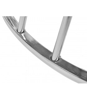 Okrągły klosz całkowicie wykonano z transparentnego szkła.Wewnątrz klosza na stelażu z czarnego metalu zawieszone jest źródło światła.