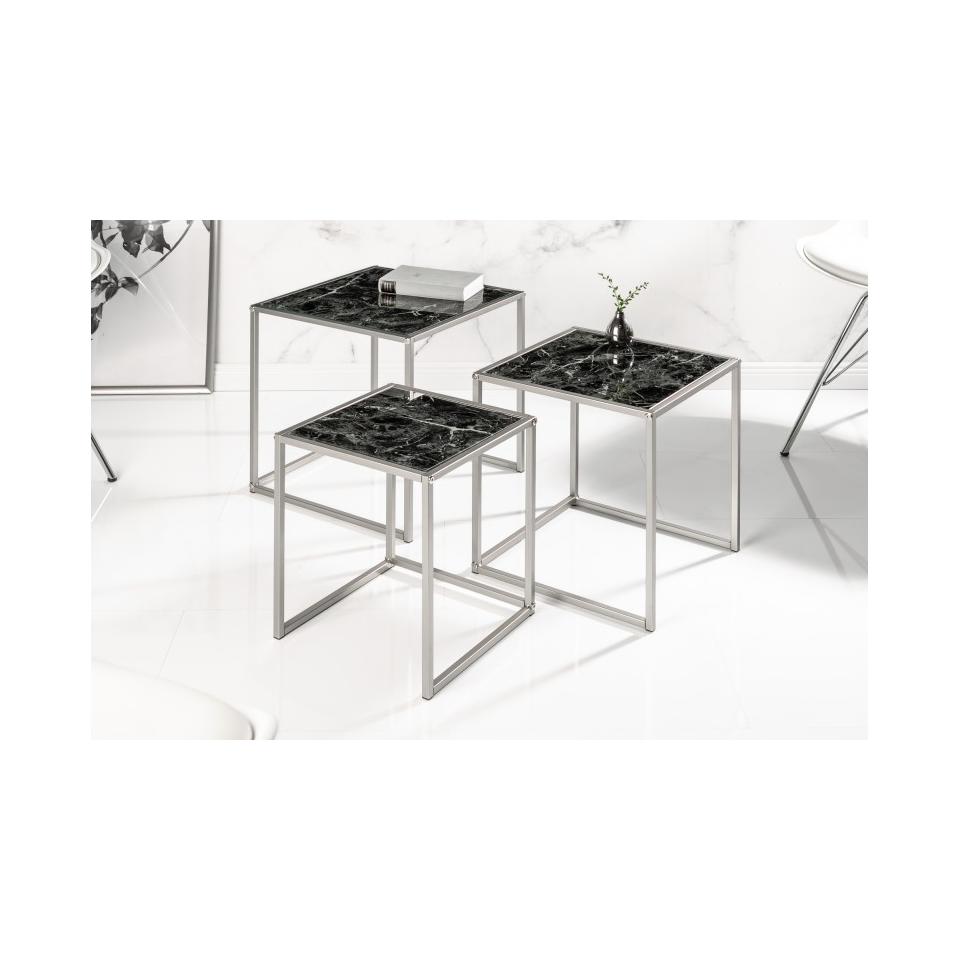 Blaty stolików zostały zaprojektowane z użyciem marmuru, co nadaje im elegancki i klasyczny wygląd, idealnie komponujący się z nowoczesnymi i klasycznymi wnętrzami.