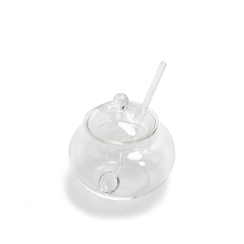 Mini cukiernica z łyżeczką SHP JAR transparentna to elegancki i praktyczny dodatek do podawania cukru, miodu oraz drobnych dodatków, idealny do codziennego użytku.