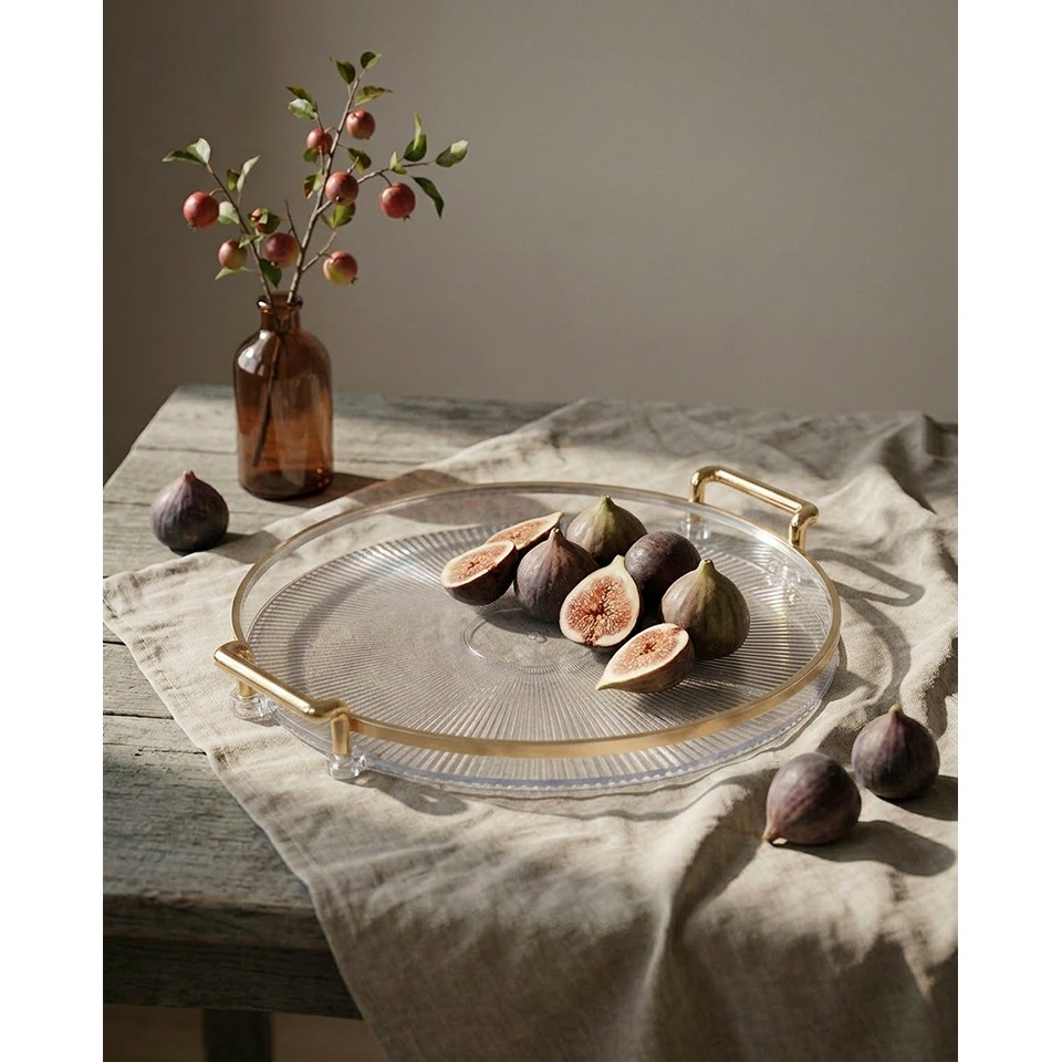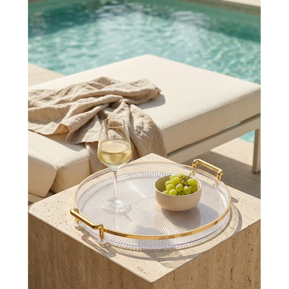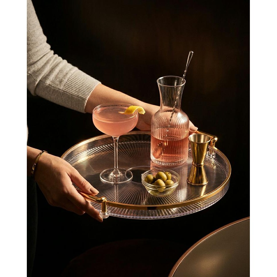 Transparentna kolorystyka nadaje całości wizualnej lekkości i sprawia, że taca dyskretnie wpisuje się w aranżację, jednocześnie przyciągając uwagę dekoracyjnymi detalami w złotym wykończeniu.