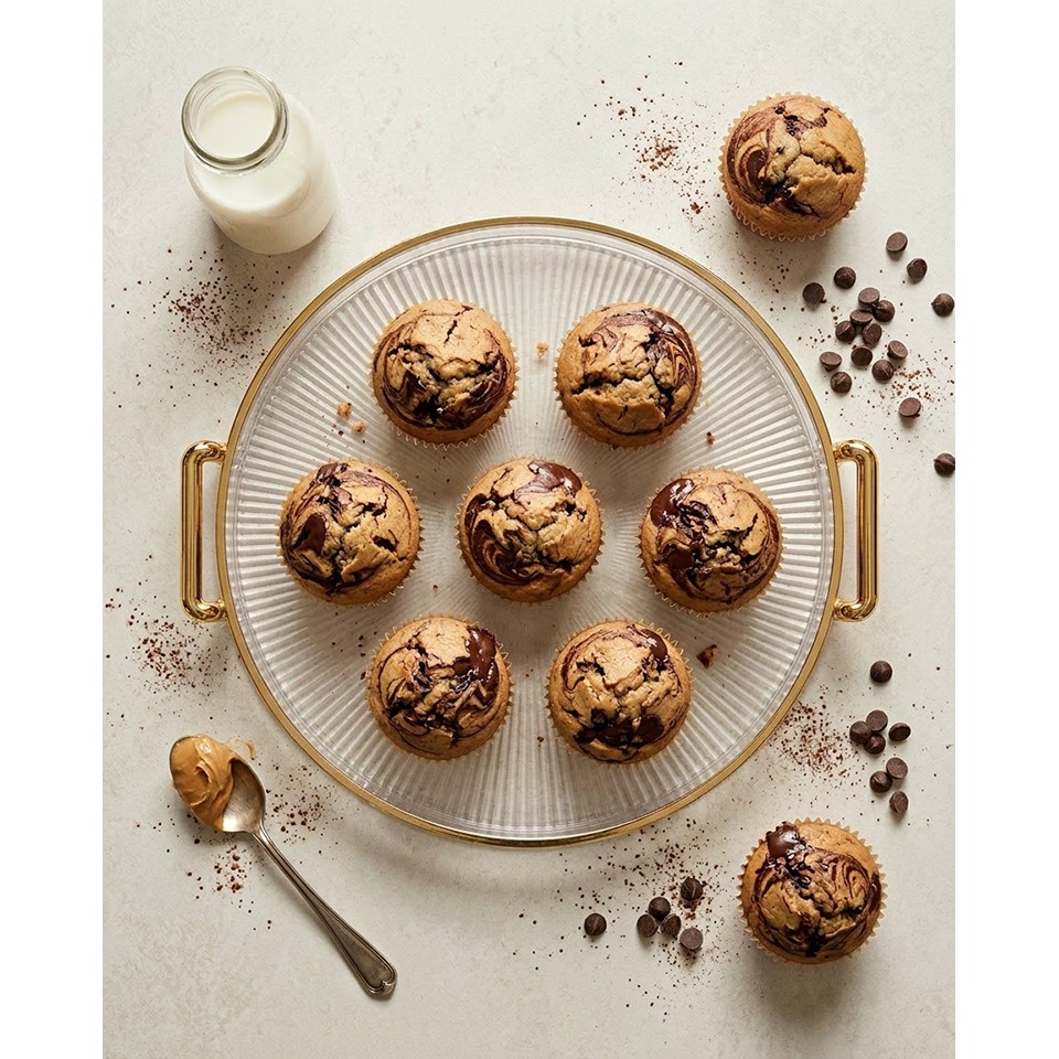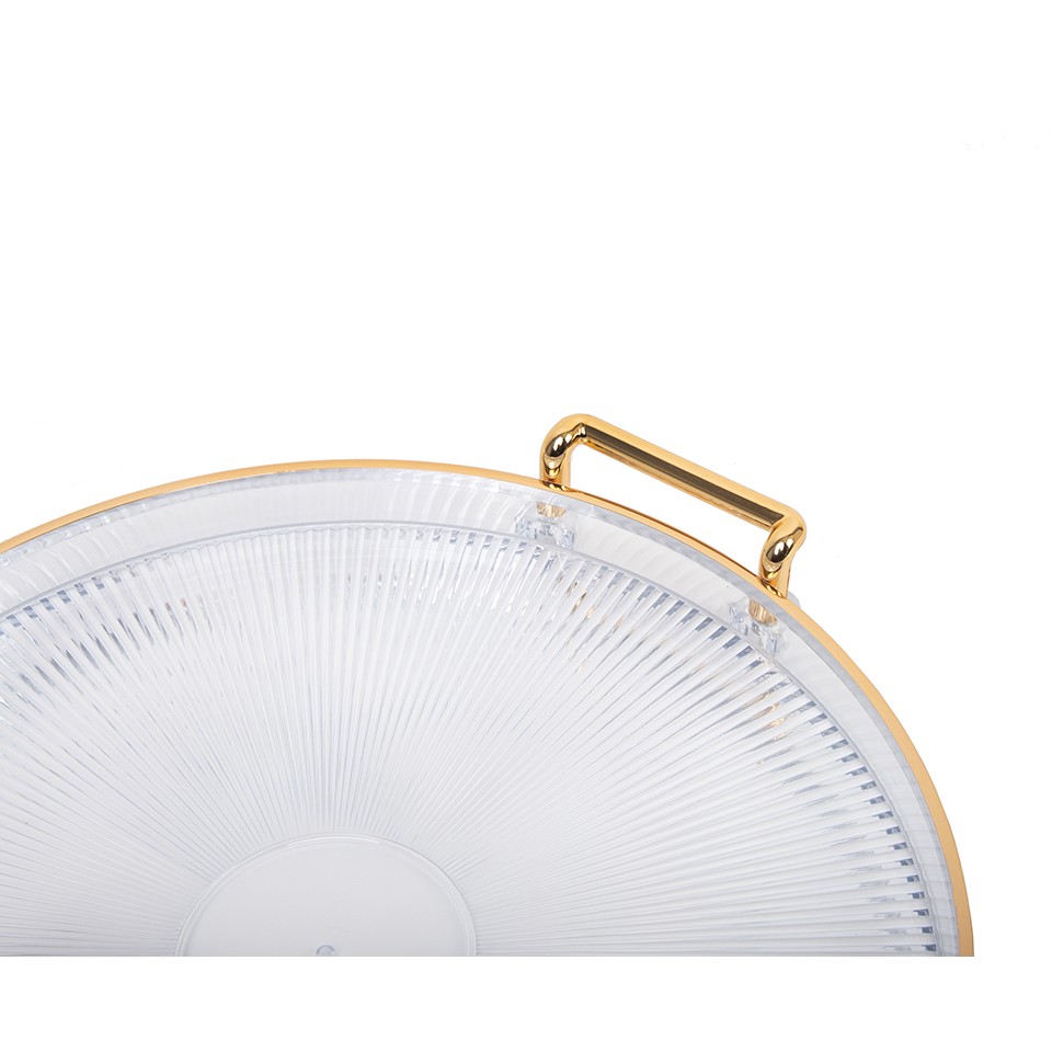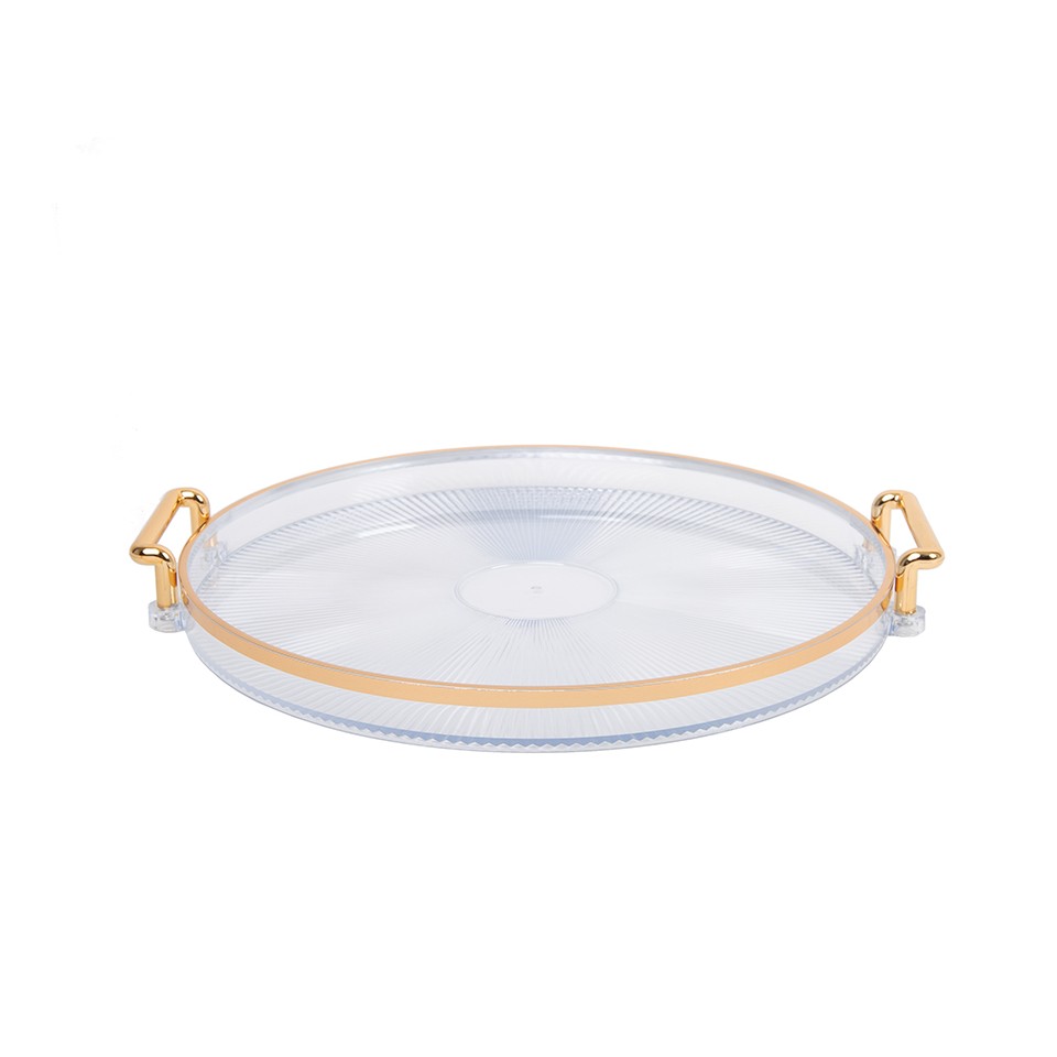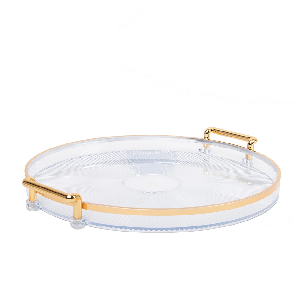 Transparentna kolorystyka nadaje całości wizualnej lekkości i sprawia, że taca dyskretnie wpisuje się w aranżację, jednocześnie przyciągając uwagę dekoracyjnymi detalami w złotym wykończeniu.