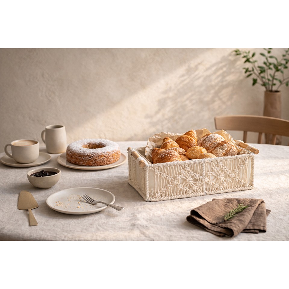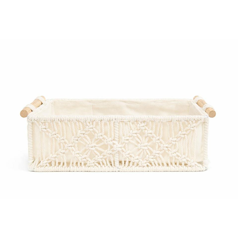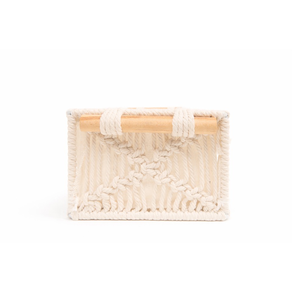 Ozdobny splot nadaje koszykowi dekoracyjny charakter, subtelnie podkreślając fakturę materiału. Miękka tkanina sprawia, że całość prezentuje się lekko i przyjemnie, a jednocześnie pozostaje praktyczna w codziennym użytkowaniu. Drewniane uchwyty podkreślają naturalny styl i dodają mu jeszcze więcej uroku.
