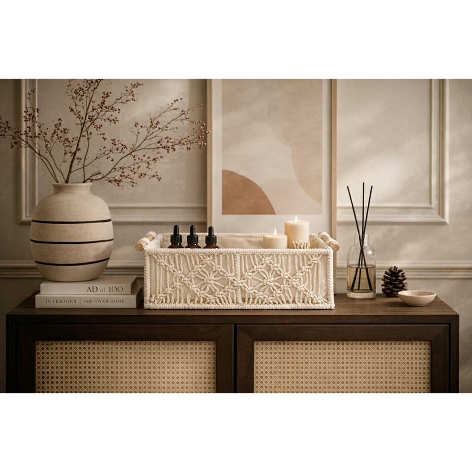 Produkt świetnie sprawdzi się w roli praktycznego organizera — idealny do przechowywania drobnych akcesoriów, tekstyliów, kosmetyków, a także dziecięcych zabawek. To funkcjonalny element, który ociepla przestrzeń i dodaje jej charakteru, niezależnie od tego, czy znajdzie się w jadalni, salonie, sypialni czy pokoju dziecka.