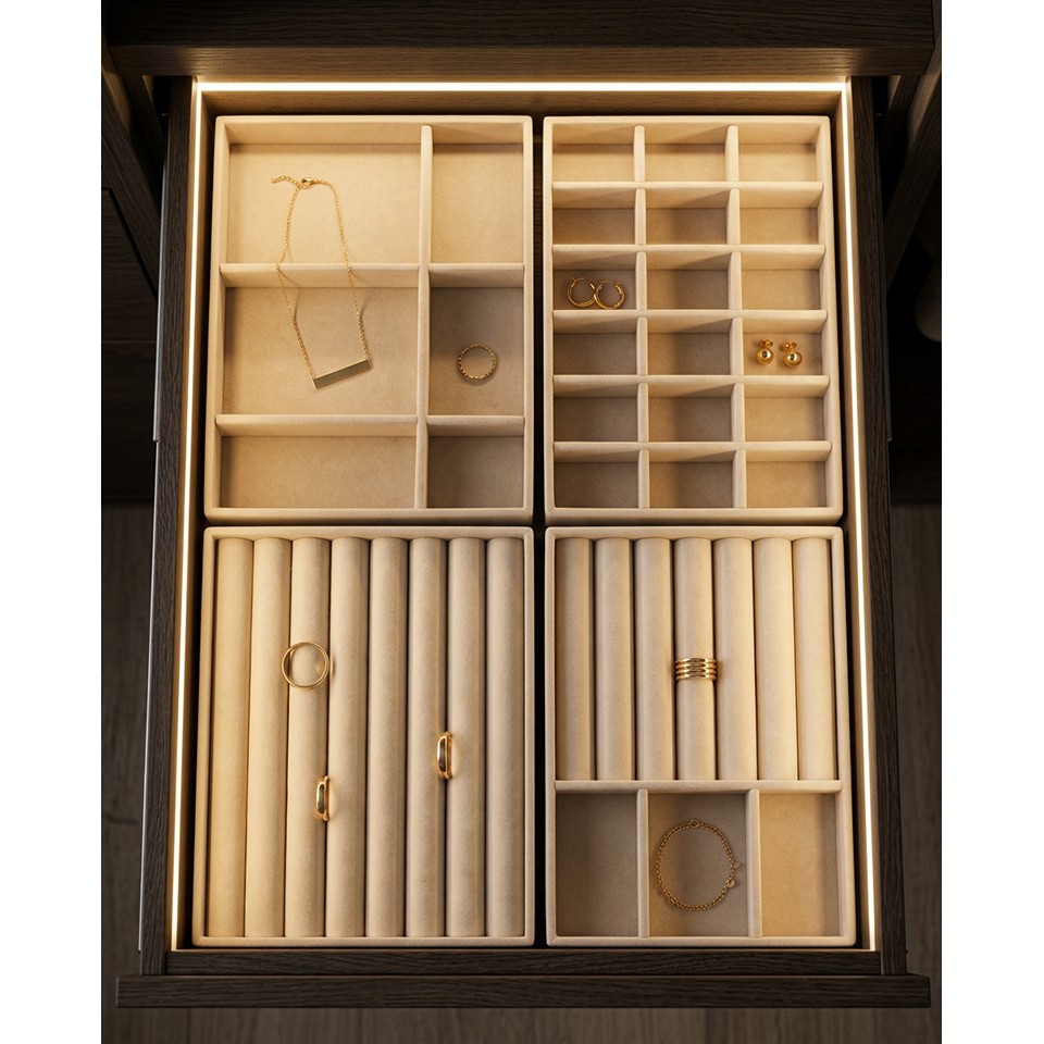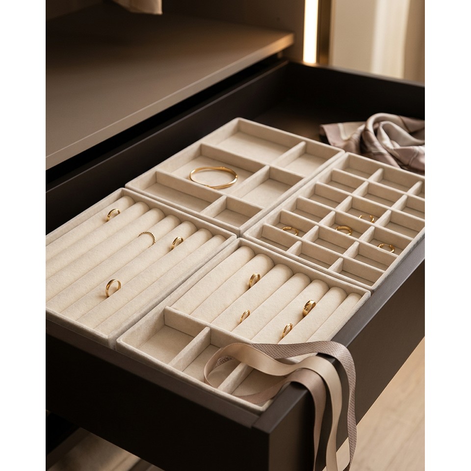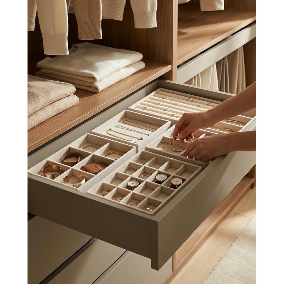 Organizer na biżuterię do szuflady SHP SORREL. to eleganckie i funkcjonalne rozwiązanie, które pozwala estetycznie uporządkować biżuterię, łącząc luksusowy wygląd z codzienną wygodą użytkowania.
