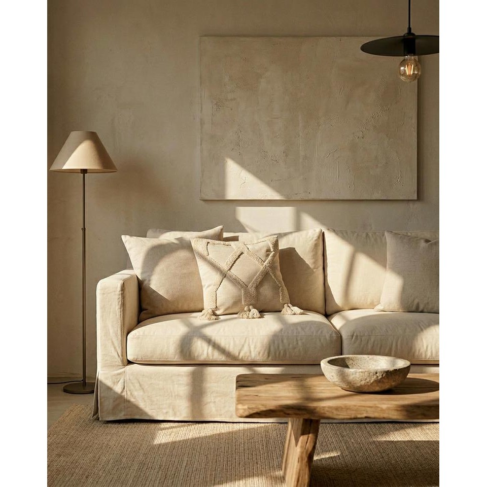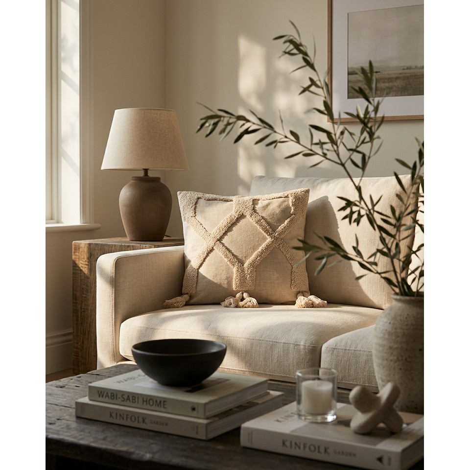 Naturalna, beżowa kolorystyka idealnie komponuje się z jasnymi, neutralnymi wnętrzami oraz drewnianymi elementami wyposażenia. Poduszka świetnie wpisuje się w stylistykę boho, japandi oraz nowoczesne aranżacje inspirowane naturą.