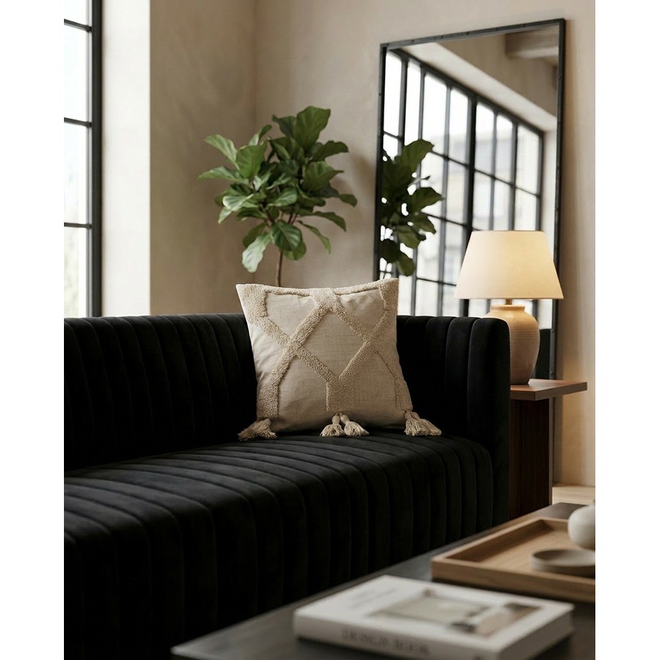 Tuftowana struktura tworzy efektowny, geometryczny wzór, który nadaje poduszce wyrazisty, a jednocześnie subtelny charakter. Starannie wykonane detale podkreślają jej dekoracyjną funkcję i estetyczną spójność.