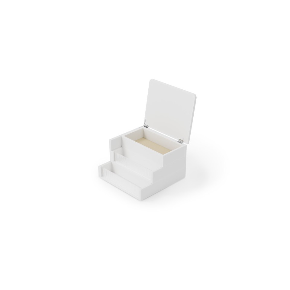 Trzy poziomy przechowywania zostały zaprojektowane tak, aby pomóc uporządkować pierścionki, kolczyki, bransoletki, naszyjniki oraz inne drobne akcesoria. Każdy element wnętrza wyściełano miękkim lnem, który chroni delikatne przedmioty przed zarysowaniami i splątaniem, zapewniając im bezpieczne przechowywanie.