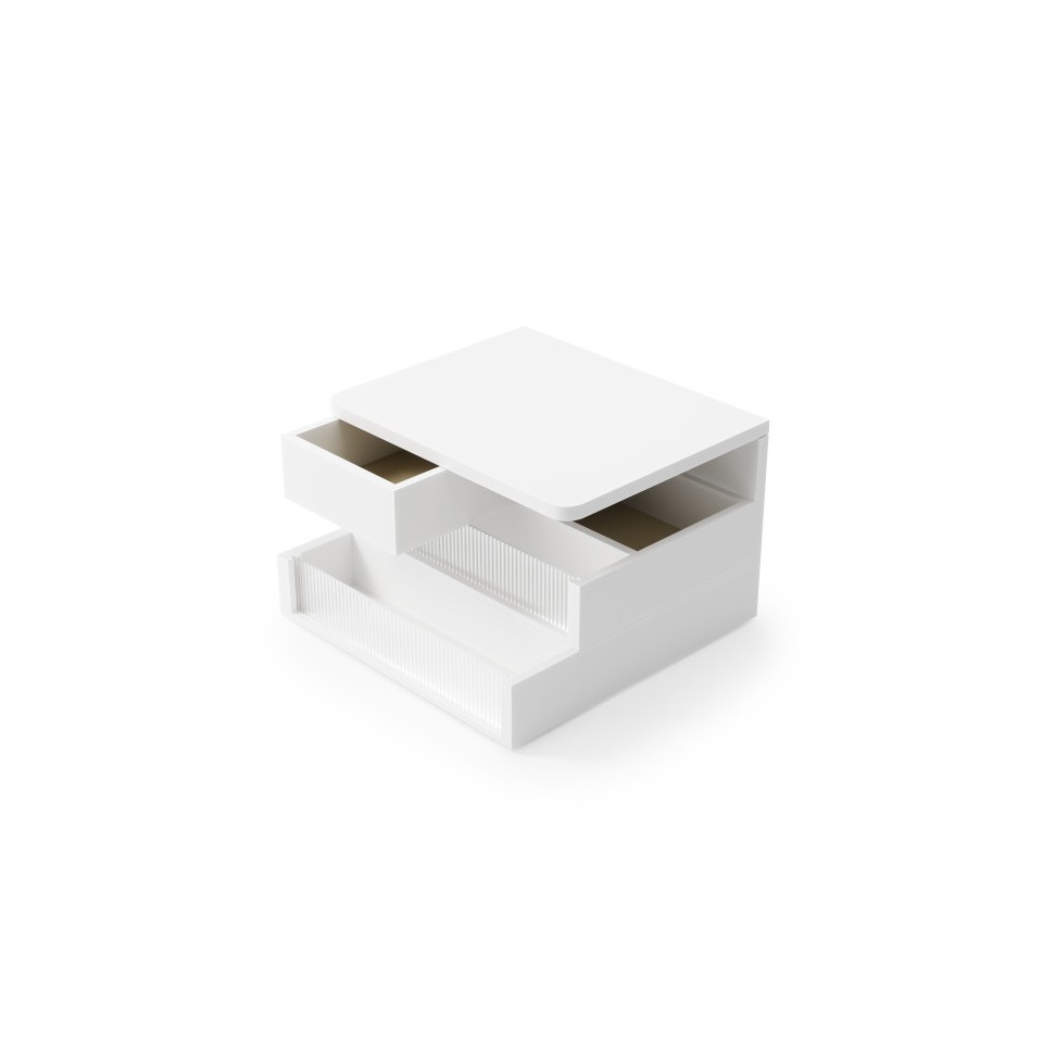 Pojemnik doskonale prezentuje się na komodzie, toaletce lub stoliku nocnym, harmonijnie komponując się z nowoczesnymi i jasnymi aranżacjami wnętrz. Jego ponadczasowy design sprawia, że pełni jednocześnie funkcję praktyczną i dekoracyjną.
