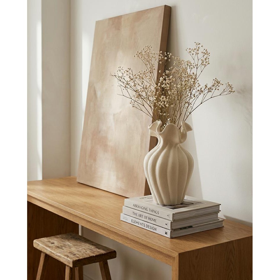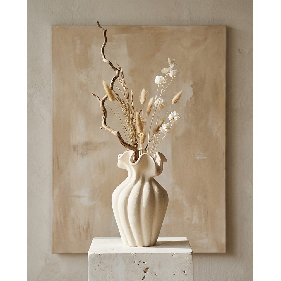 Dzięki neutralnej kolorystyce i artystycznej formie wazon świetnie odnajduje się w różnorodnych aranżacjach — od nowoczesnych i minimalistycznych, po japandi, boho oraz wnętrza inspirowane naturą. Doskonale prezentuje się zarówno z kwiatami, jak i jako samodzielny akcent dekoracyjny.