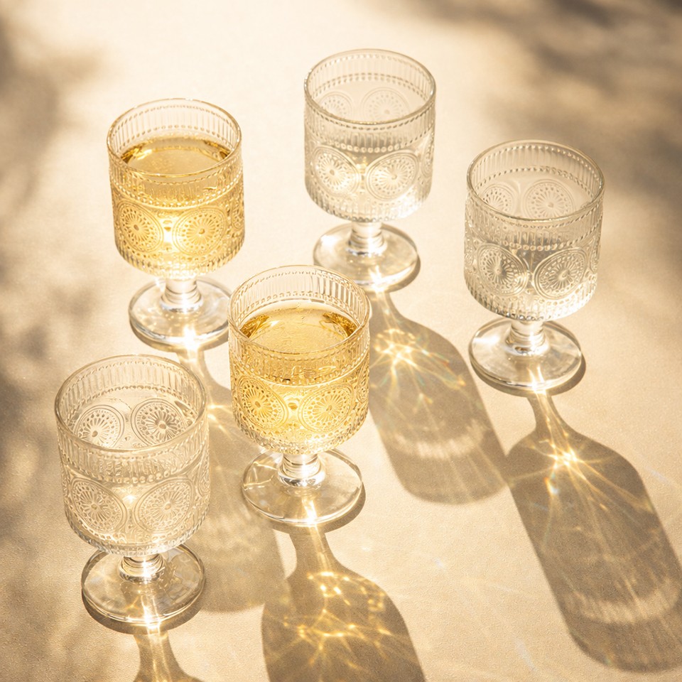 Wykonane ze szkła, szklanki łączą trwałość z eleganckim, transparentnym wyglądem. Tłoczone wzory pięknie rozpraszają światło, nadając im dekoracyjny charakter i podkreślając ich romantyczną, a przy tym ponadczasową stylistykę.