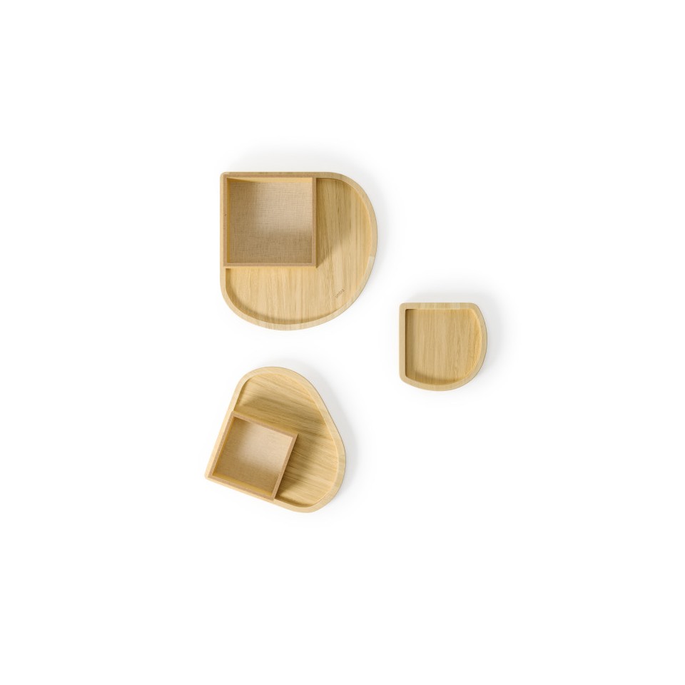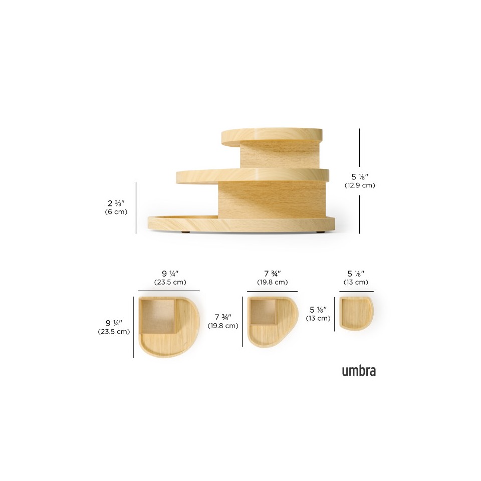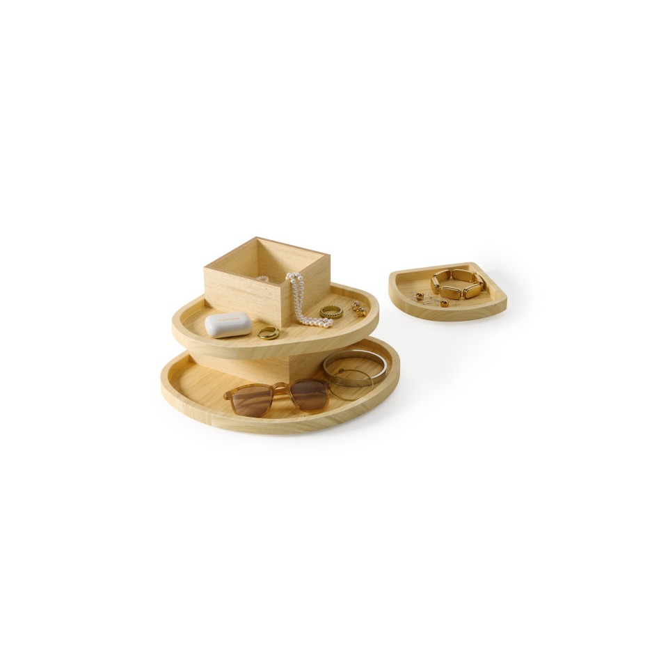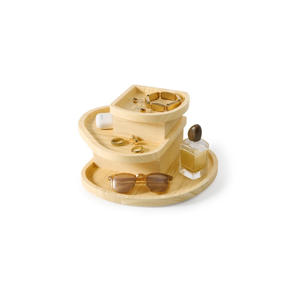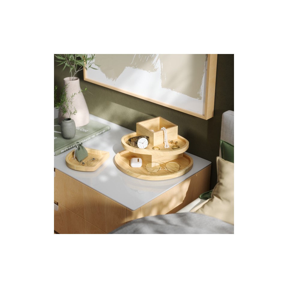 Trójpoziomowa konstrukcja z wyraźnie zaznaczonymi, miękkimi liniami pozwala wygodnie uporządkować biżuterię, zegarki oraz codzienne akcesoria.