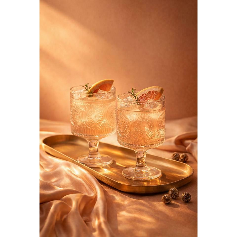 Każda szklanka zachwyca subtelnymi, tłoczonymi wzorami inspirowanymi motywami roślinnymi, które pięknie rozpraszają światło.