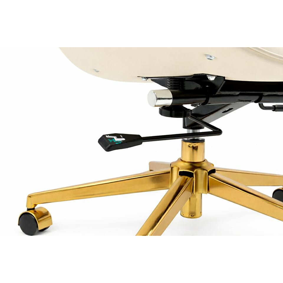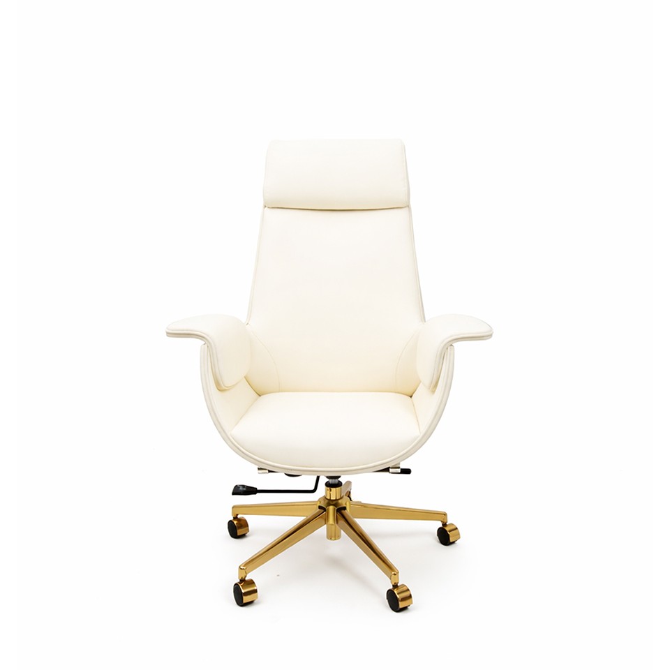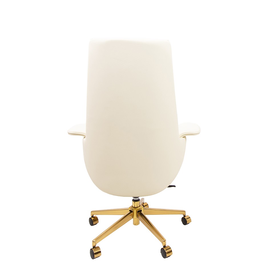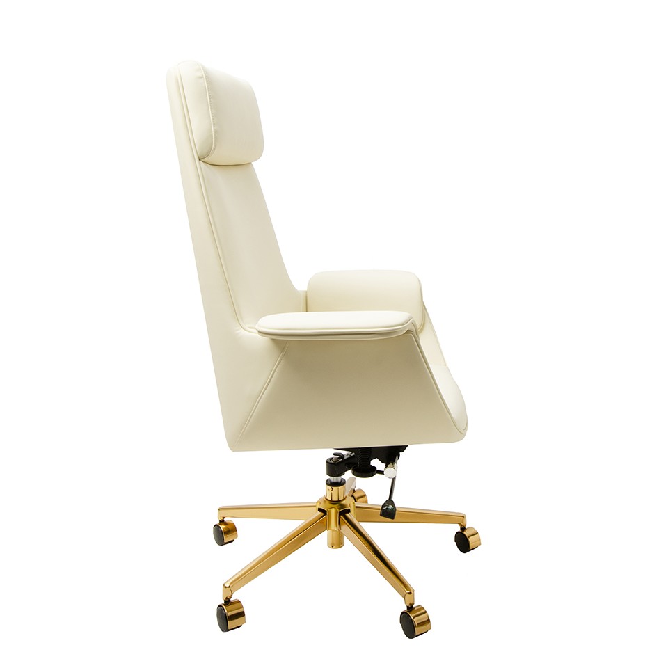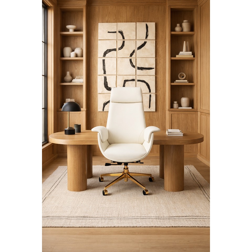 Tapicerowany miękką, wysokiej jakości skórą ekologiczną w odcieniu ecru zachwyca profilowanym oparciem z zagłówkiem oraz stylowym wykończeniem z ekoskóry imitującej drewno. Ergonomiczna konstrukcja z możliwością regulacji wysokości i odchylenia oparcia zapewnia wygodę nawet podczas wielogodzinnej pracy.