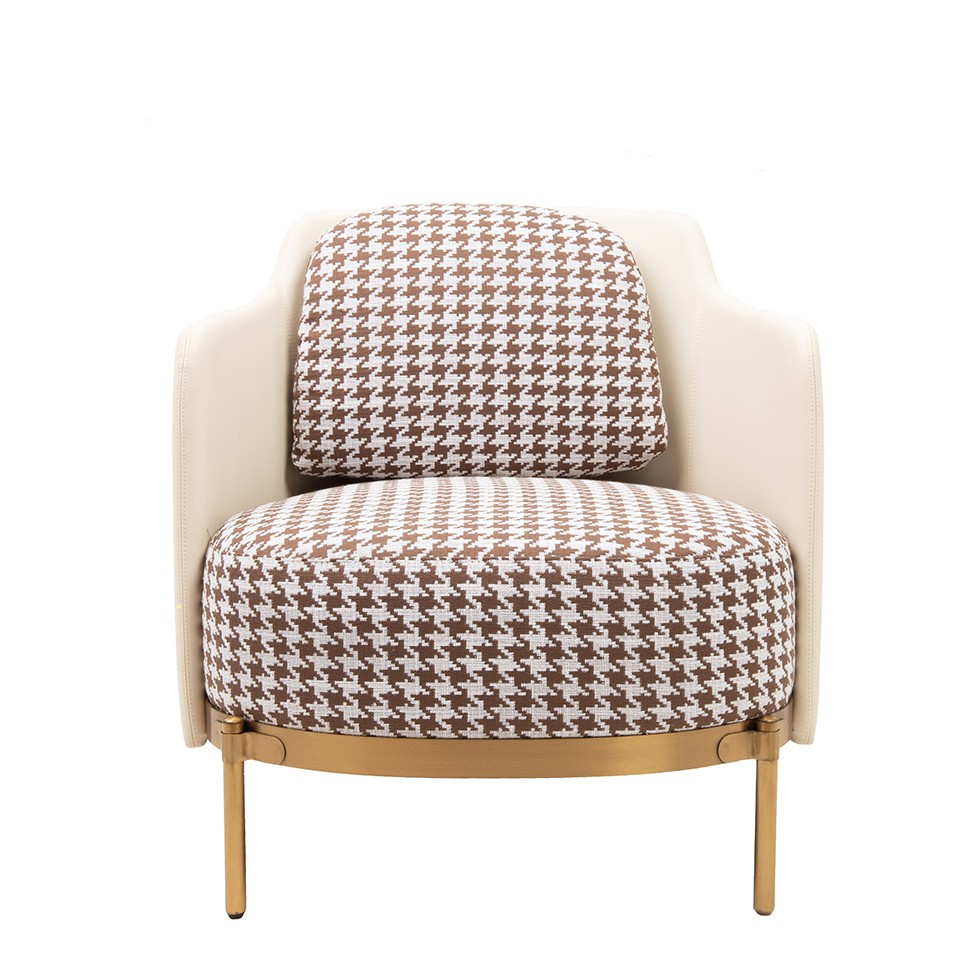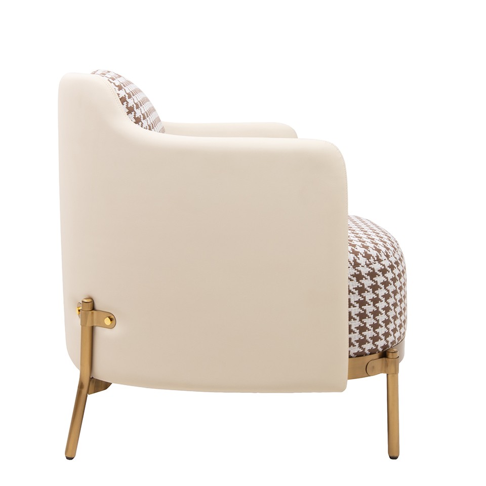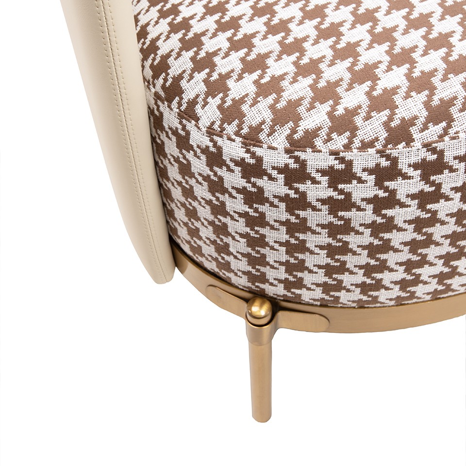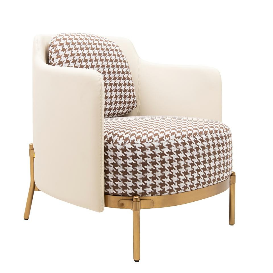 Fotel VENICE tkanina pepitka biało-brązowa - złota podstawa, beżowa ekoskóra.