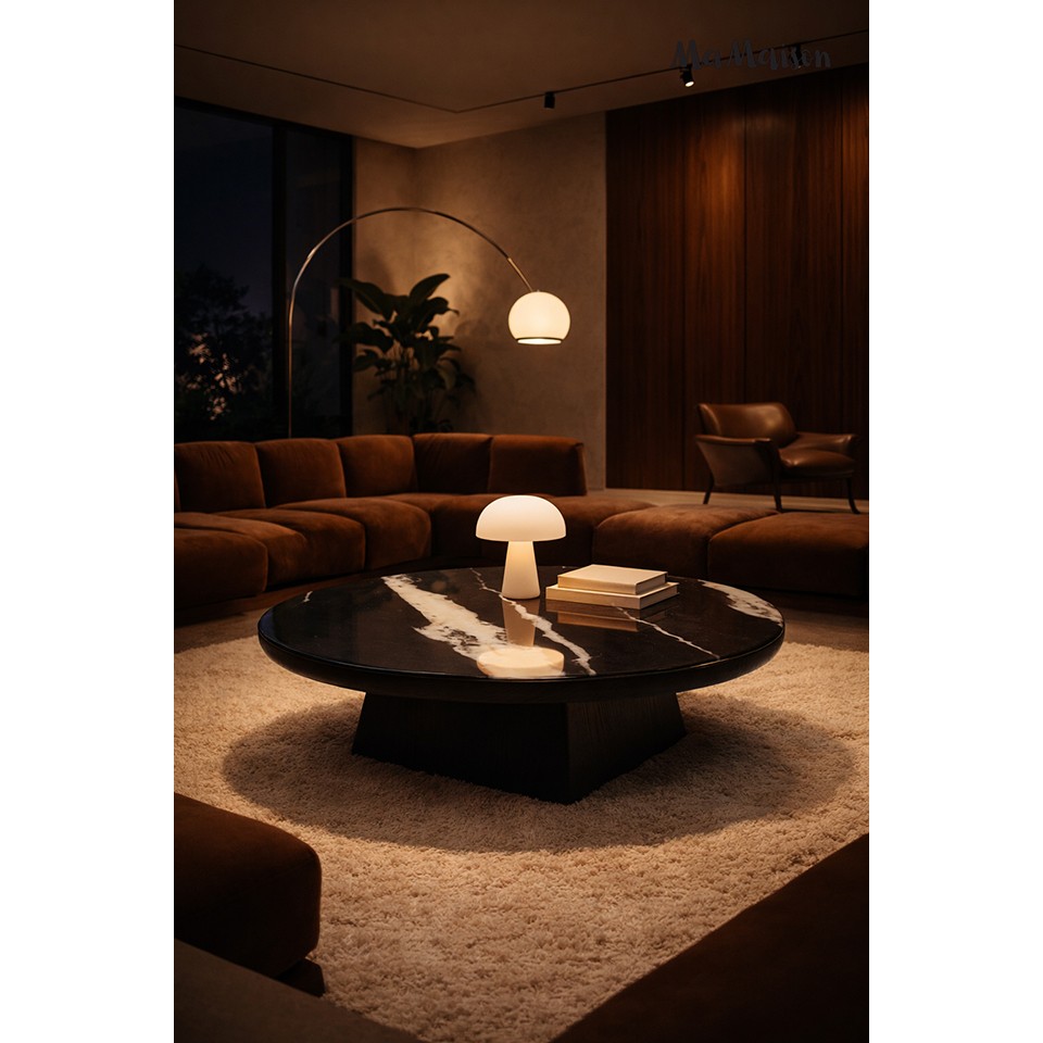 Okrągły blat z żywicy zachwyca subtelnym, marmurowym wzorem, który nadaje powierzchni głębi i elegancji.