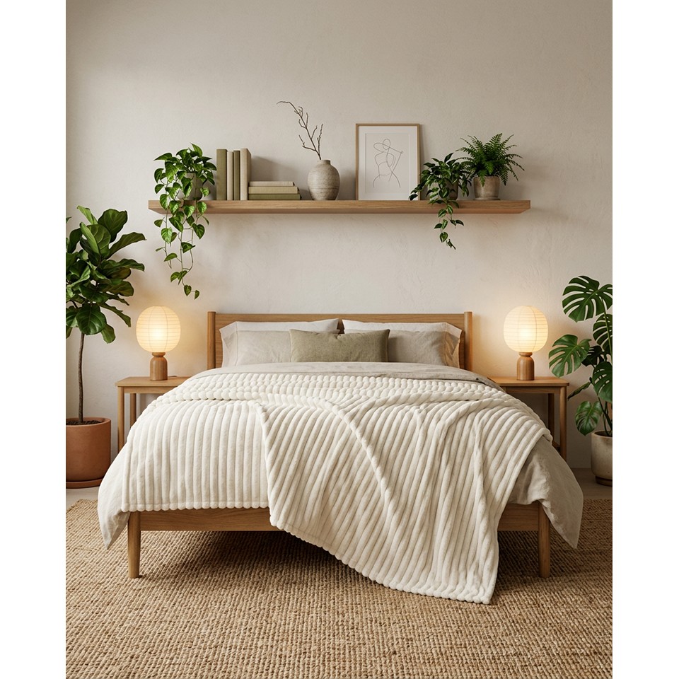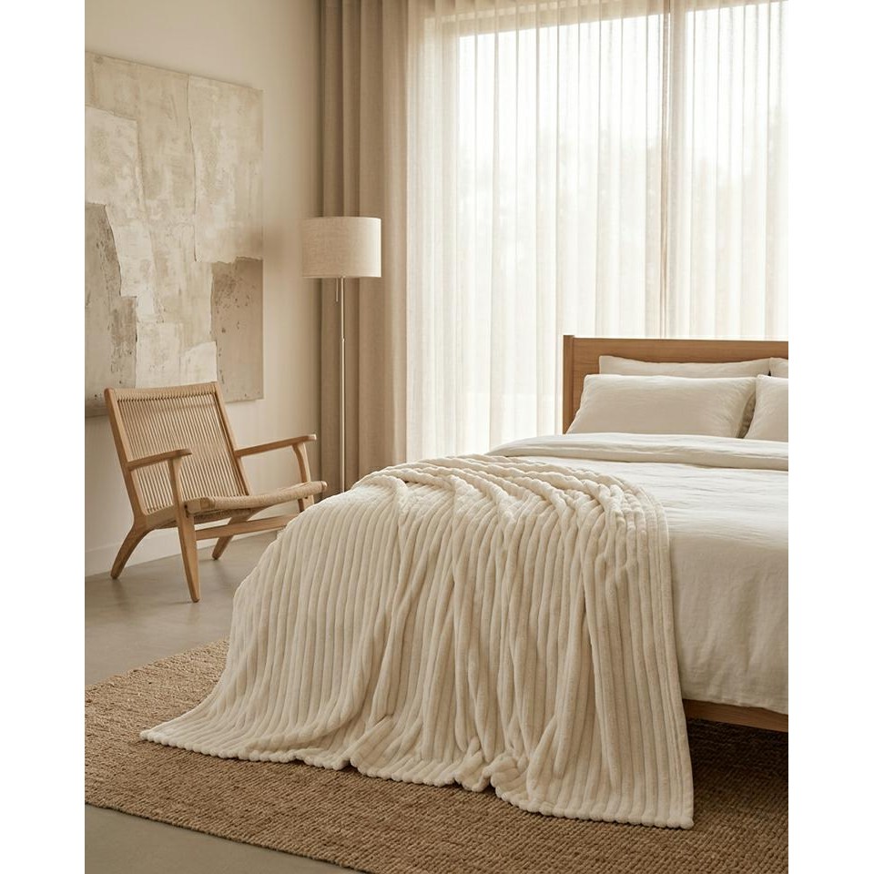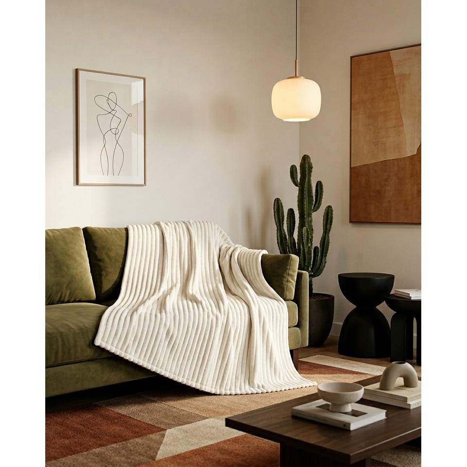 Miękka, przyjemna w dotyku tkanina o subtelnej, prążkowanej strukturze otula ciepłem i tworzy przytulną atmosferę w każdym wnętrzu.