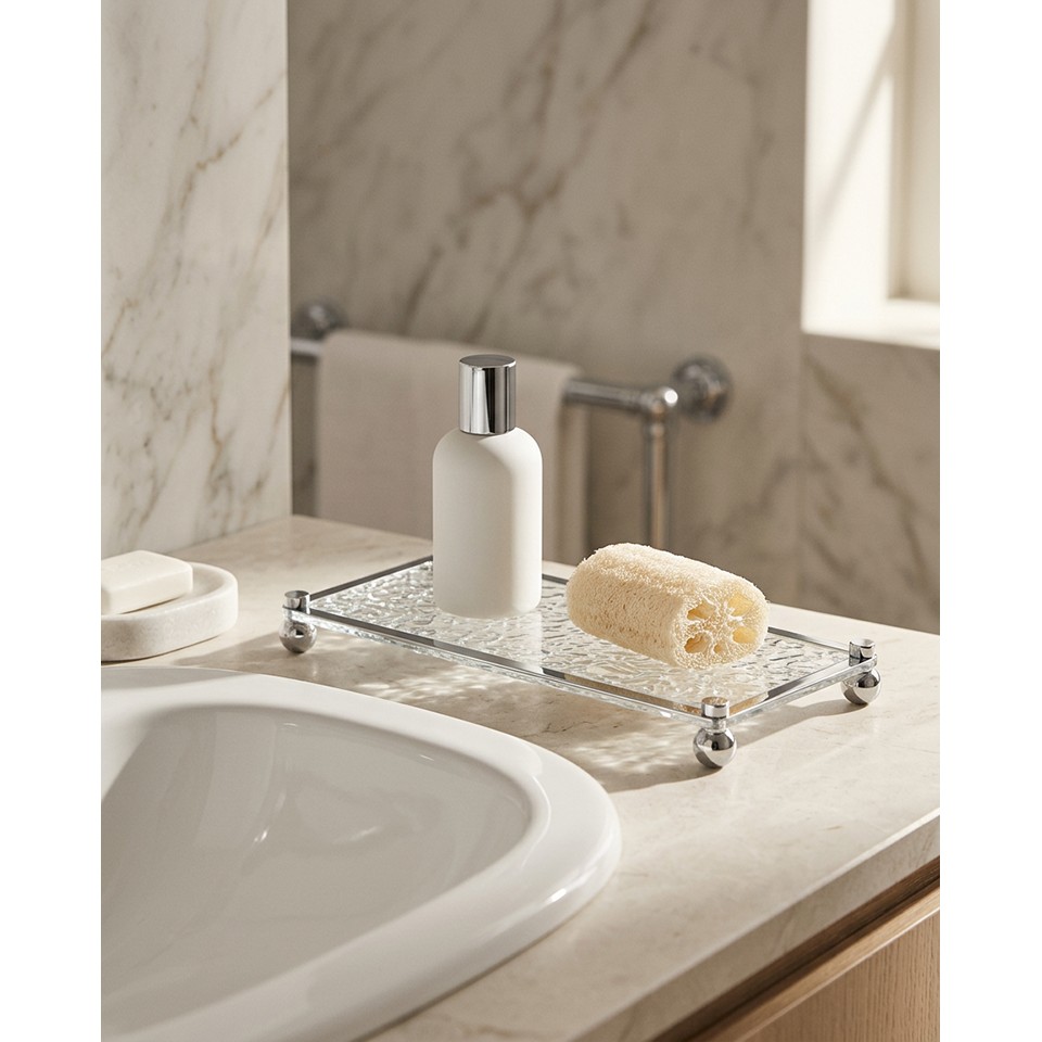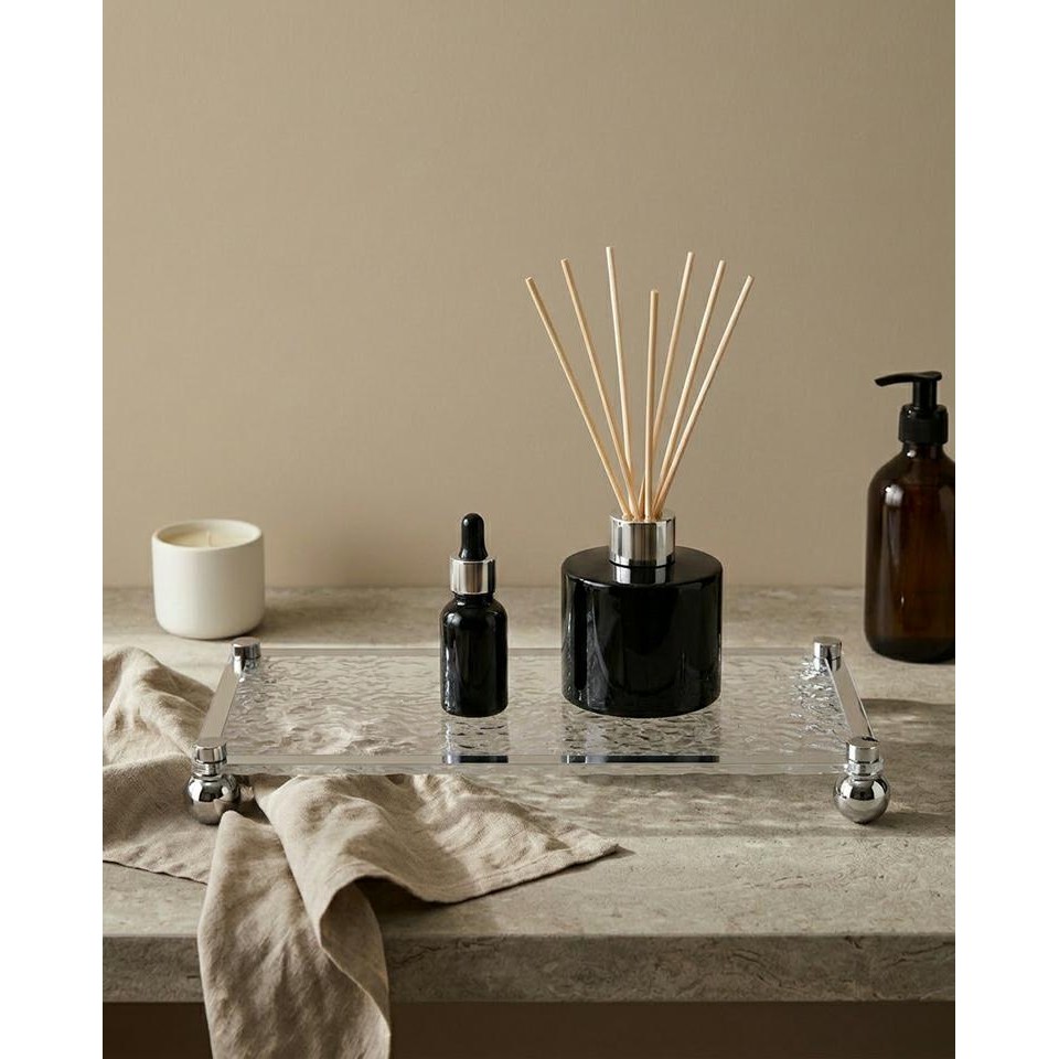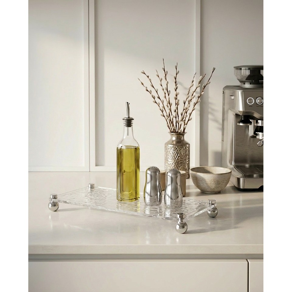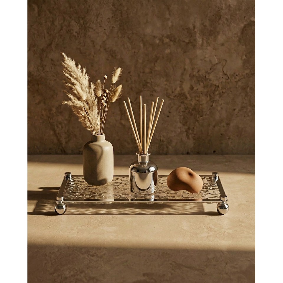 Wykonana z akrylu taca, zachwyca lekkością formy oraz delikatną, strukturalną powierzchnią, która efektownie odbija światło.
