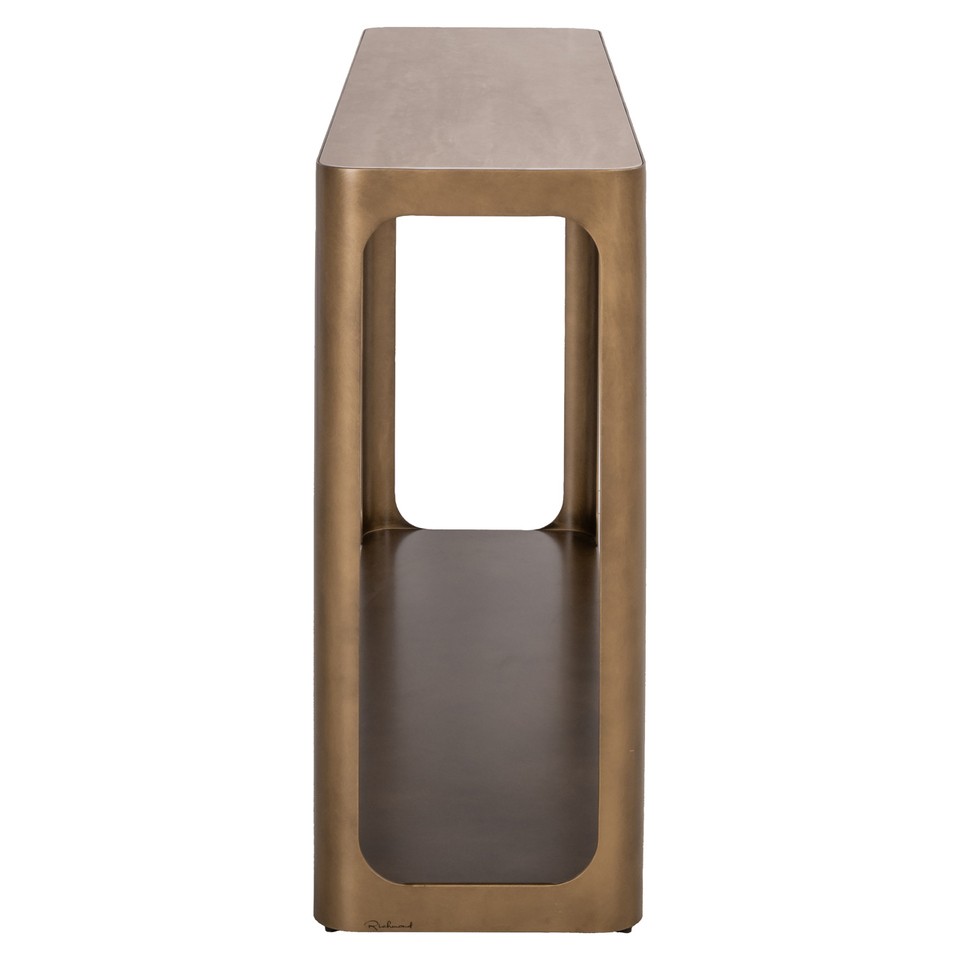 Geometryczna forma została wzbogacona o blat z piaskowej ceramiki, osadzony na smukłej ramie z metalu w odcieniu szczotkowanego złota.