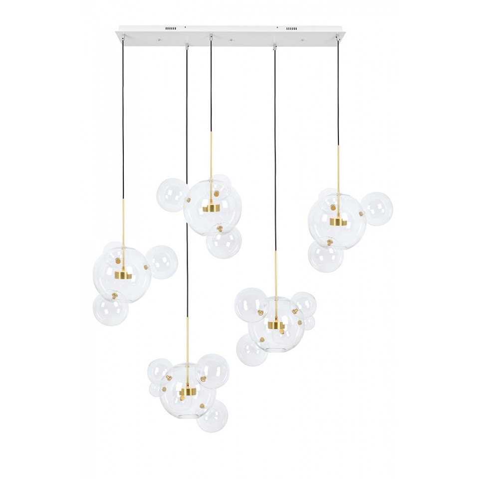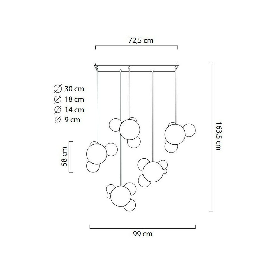 W centrum konstrukcji znajduje się pięć głównych kul, zawieszonych na przewodach wychodzących z jednej podsufitki. W każdej z nich umieszczony jest złoty pręt, zakończony nowoczesnym źródłem światła LED. Snop światła kierowany jest zarówno w dół, jak i do góry, co potęguje wizualny efekt i równomierne oświetlenie pomieszczenia.