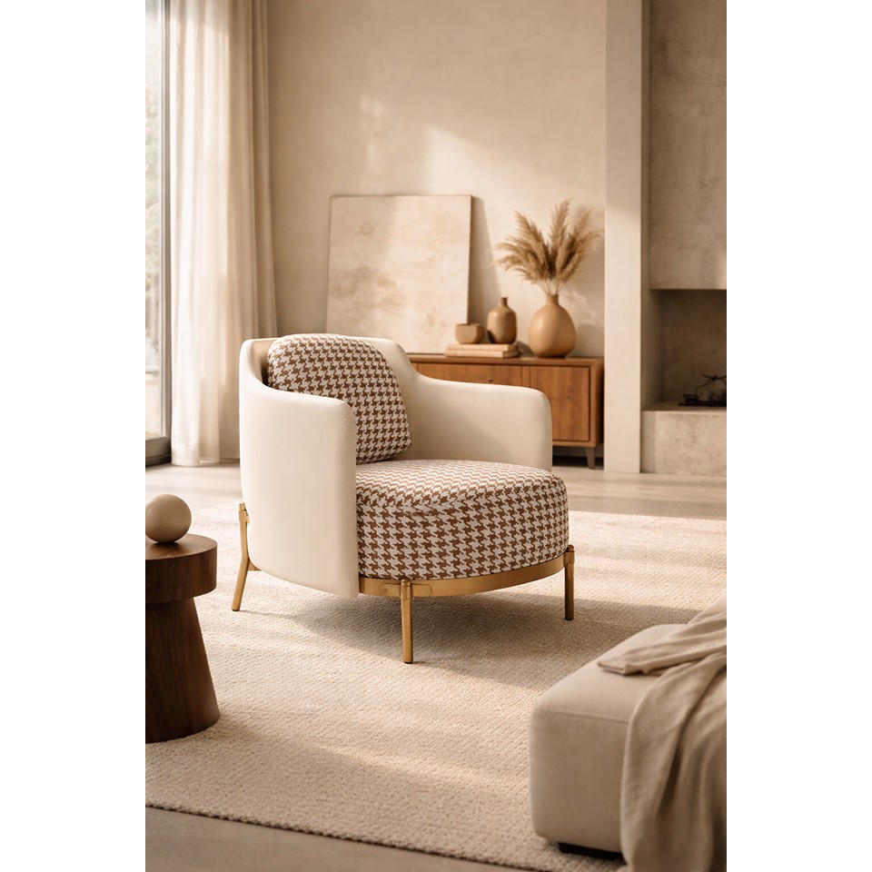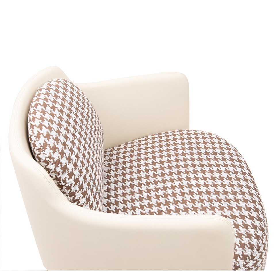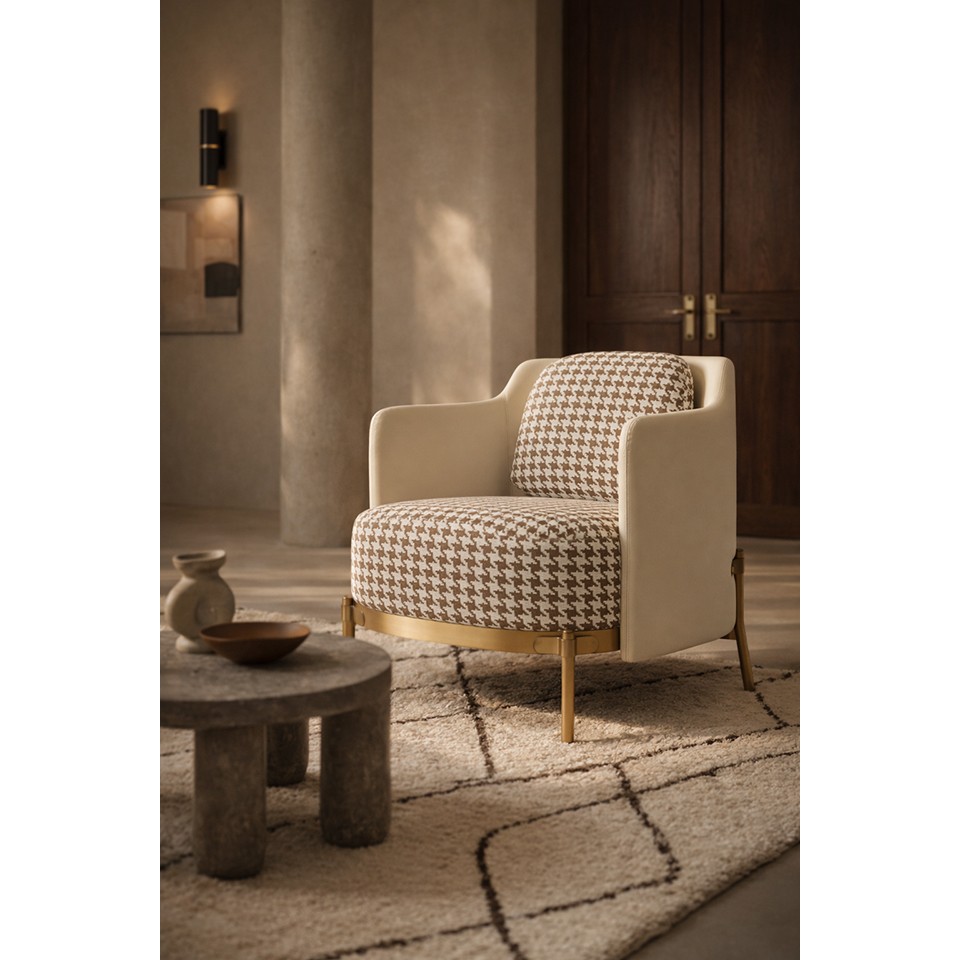 Fotel VENICE tkanina pepitka biało-brązowa – złota podstawa, beżowa ekoskóra to elegancki i nowoczesny fotel, łączący wyjątkowy design z komfortem codziennego użytkowania.