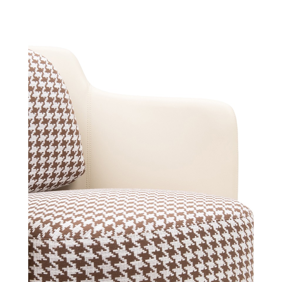Fotel VENICE zachwyca stylowym połączeniem biało-brązowej pepitki z jasnobeżową ekoskórą, tworząc harmonijny i wyrafinowany efekt wizualny. Jego nowoczesna forma doskonale wpisuje się w aranżacje, które łączą elegancję z oryginalnym charakterem.