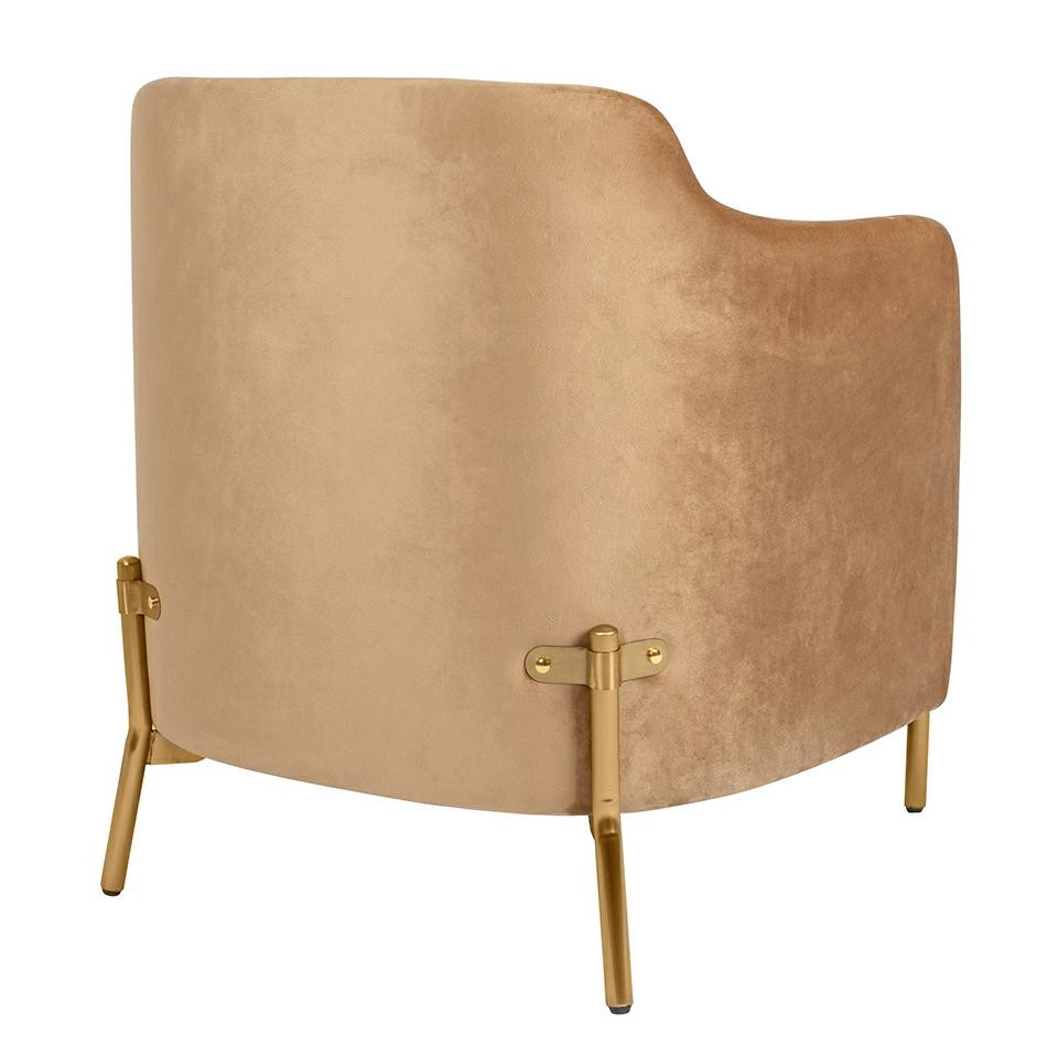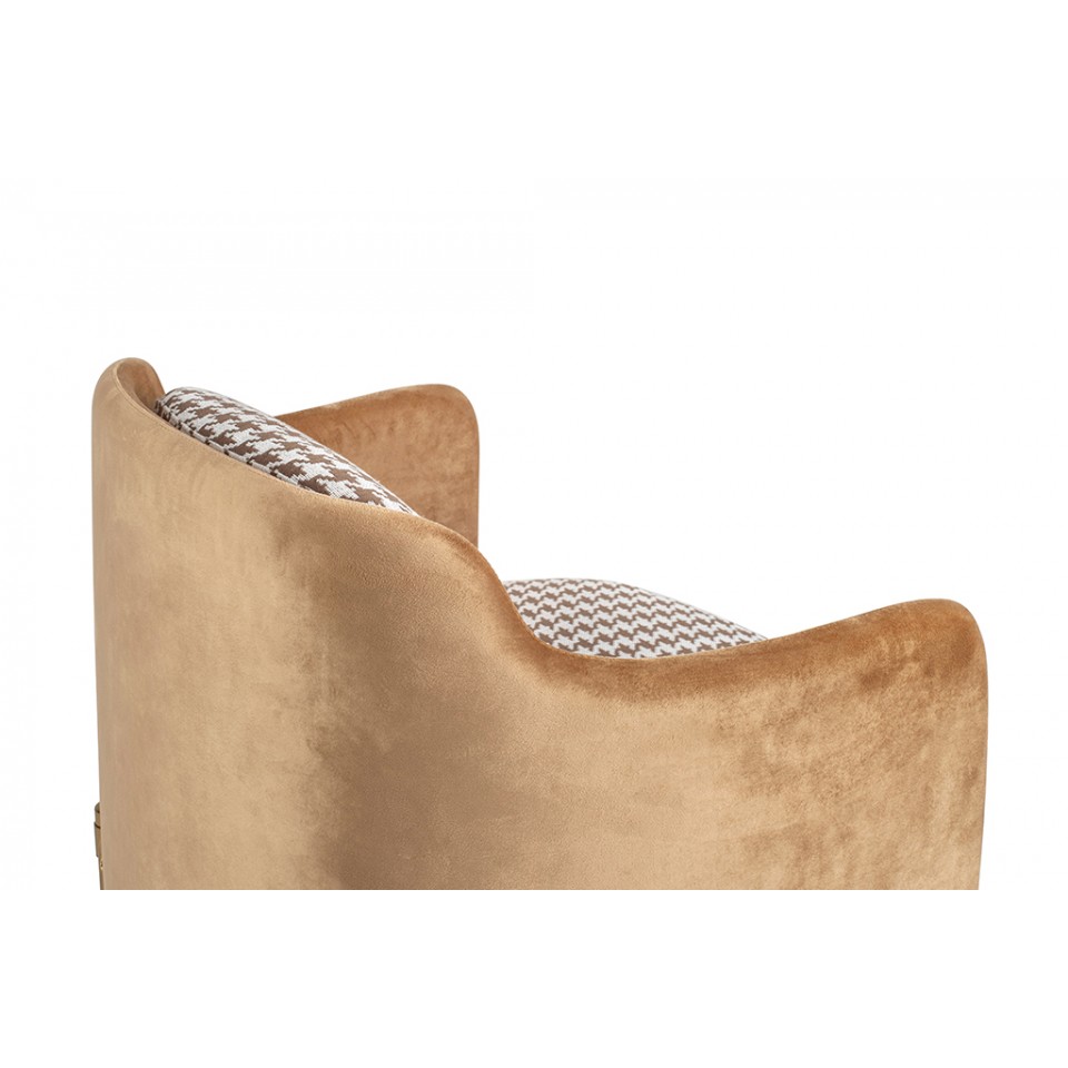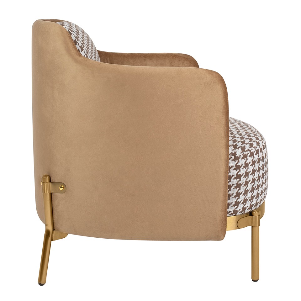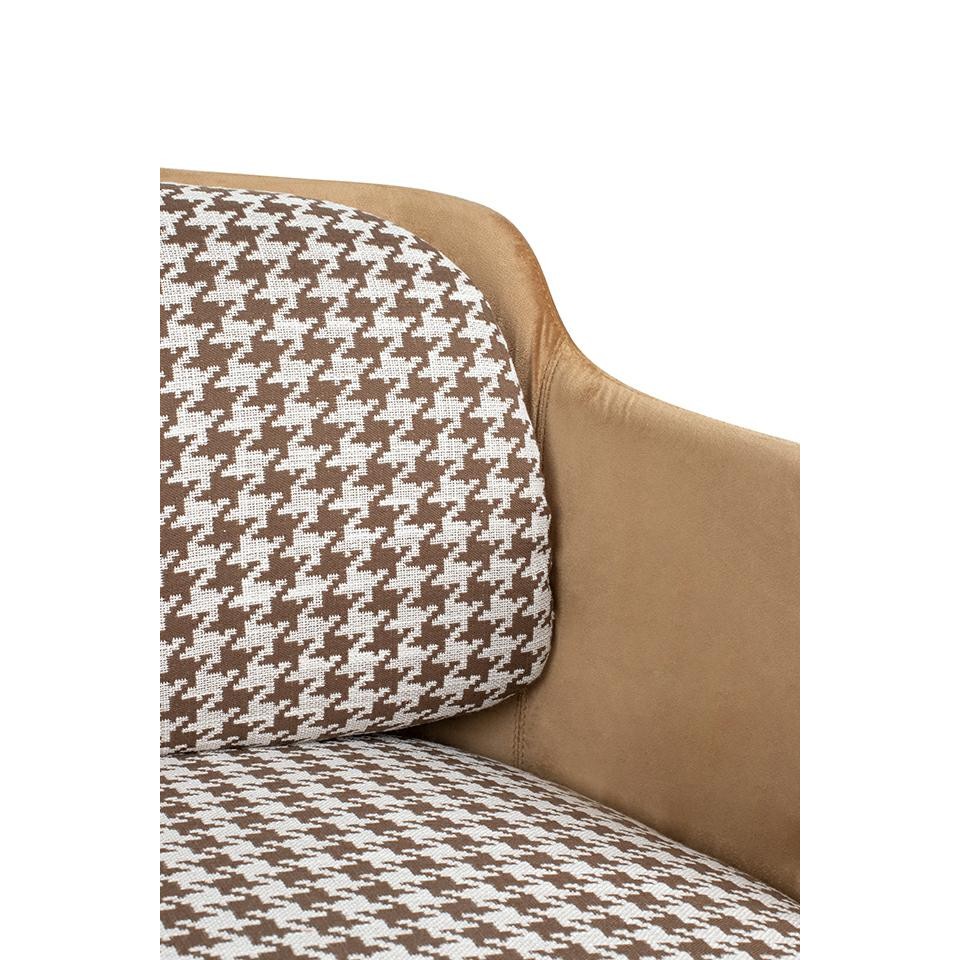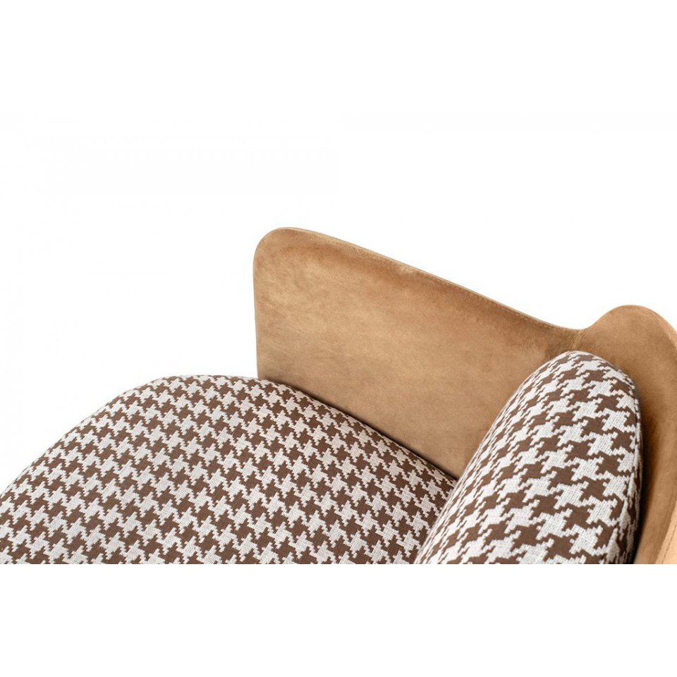 Siedzisko wraz z poduszką tapicerowane jest wysokiej jakości tkaniną w biało-brązową pepitkę, która nadaje fotelowi modnego i wyrazistego charakteru. Tył oparcia oraz podłokietniki obszyto miękkim, aksamitnym welurem w ciepłym brązowym odcieniu, wprowadzając subtelną elegancję oraz przyjemną w dotyku powierzchnię.
