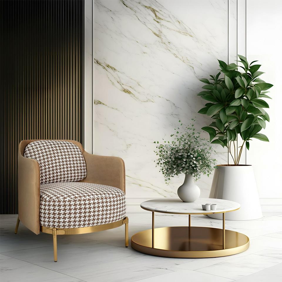 Fotel VENICE tkanina pepitka biało - brązowa to elegancki, stylowy fotel łączący wzorzystą pepitkę z welurem i złotą podstawą, idealny do nowoczesnych wnętrz.