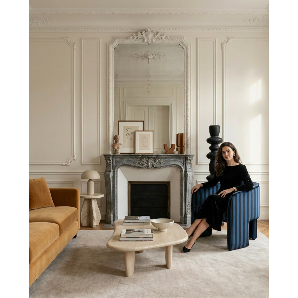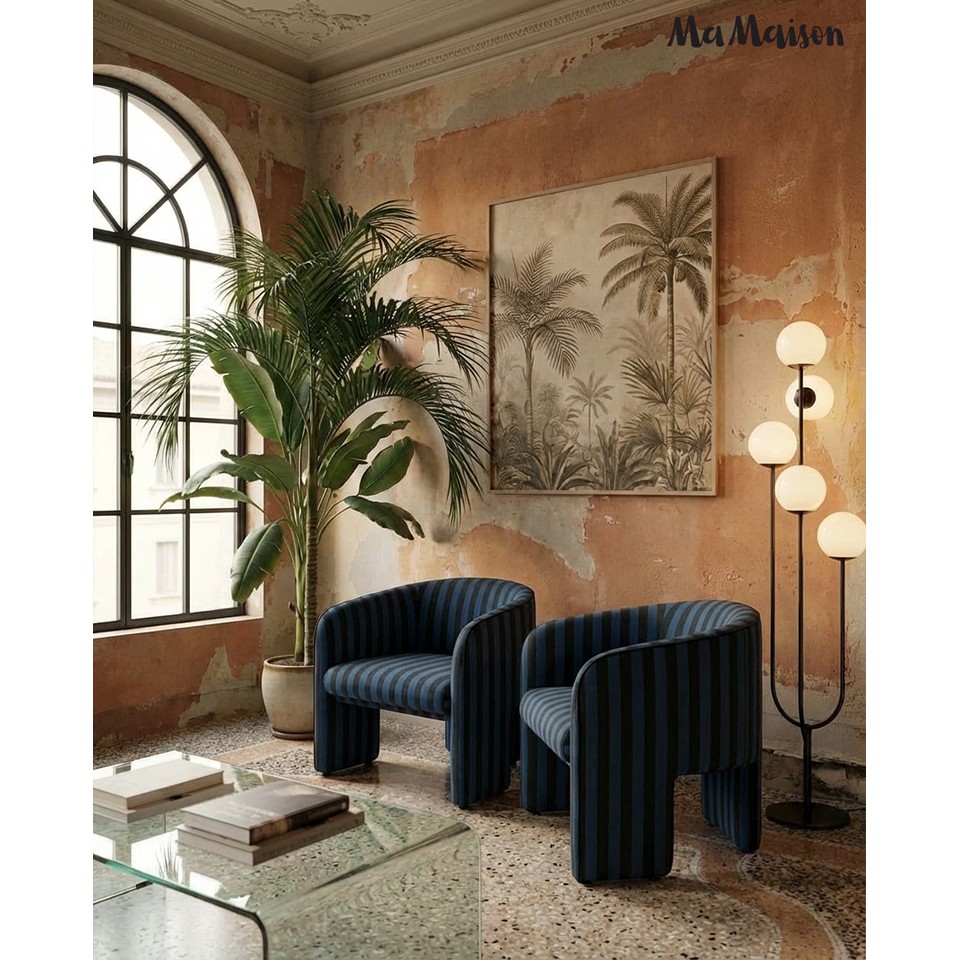 MaMaison fotel tapicerowany JOLIE niebieski czarny to elegancki fotel o wyrazistym, pasowym wzorze, który łączy designerski charakter z komfortem codziennego wypoczynku.