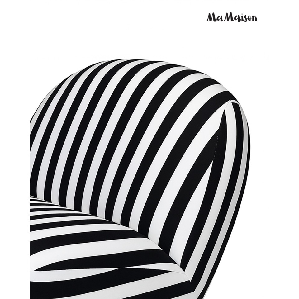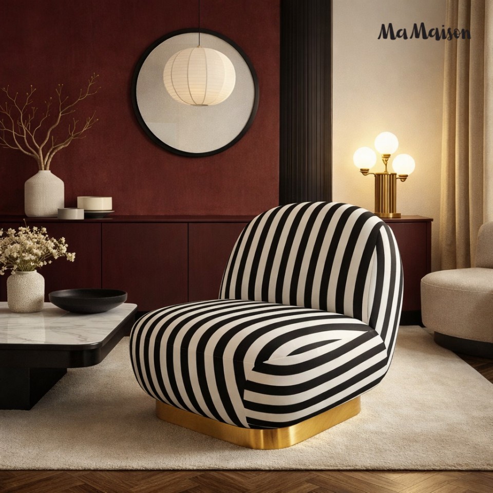 Fotel obrotowy AZURE marki MaMaison przyciąga uwagę dynamicznym zestawieniem czerni i bieli, tworząc mocny punkt aranżacyjny w każdej przestrzeni. Kontrastowe pasy nadają mu nowoczesny i odważny wygląd, który doskonale odnajdzie się zarówno w domowych wnętrzach, jak i w przestrzeniach komercyjnych.