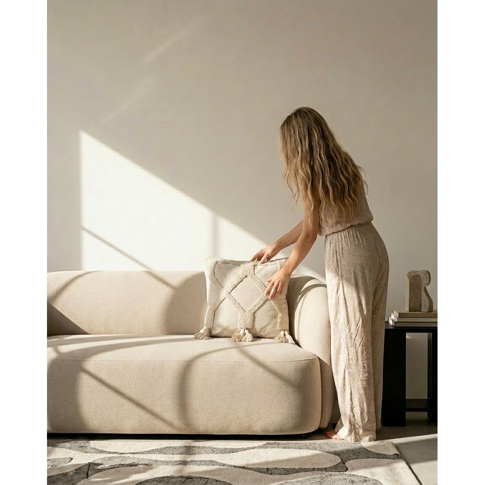 Tuftowana struktura tworzy efektowny, geometryczny wzór, nadając poduszce wyjątkowy charakter w stylu boho i japandi.