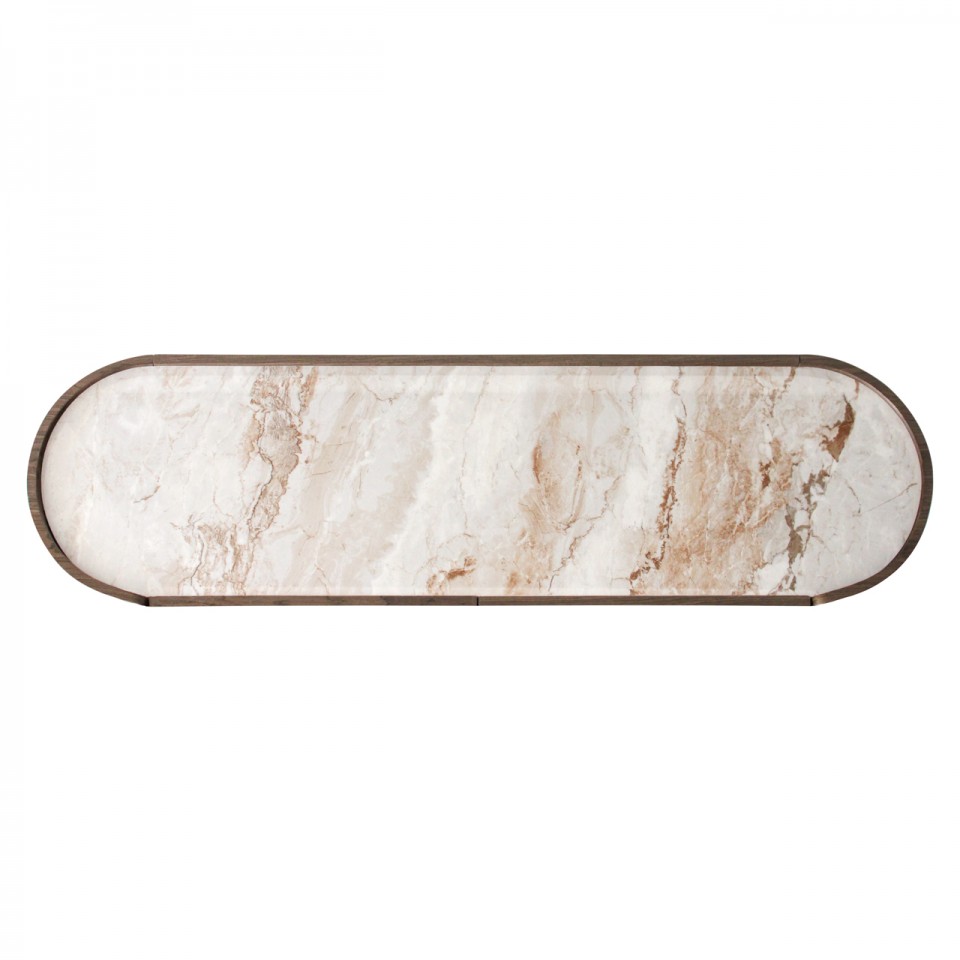 Ciepły brązowy odcień połączony z naturalnym usłojeniem nadaje komodzie szlachetny, wyważony wygląd. Uzupełnieniem konstrukcji jest blat z ceramiki, który subtelnie kontrastuje z bryłą mebla, dodając całości nowoczesnego wyrafinowania oraz zapewniając większą odporność na uszkodzenia.