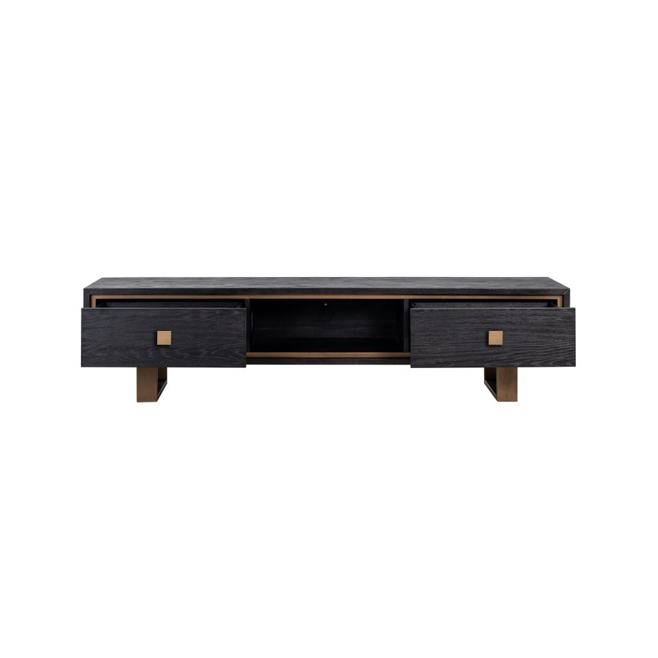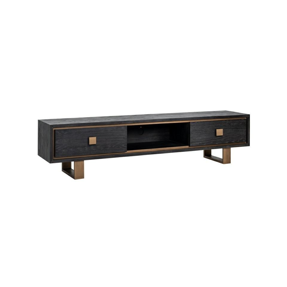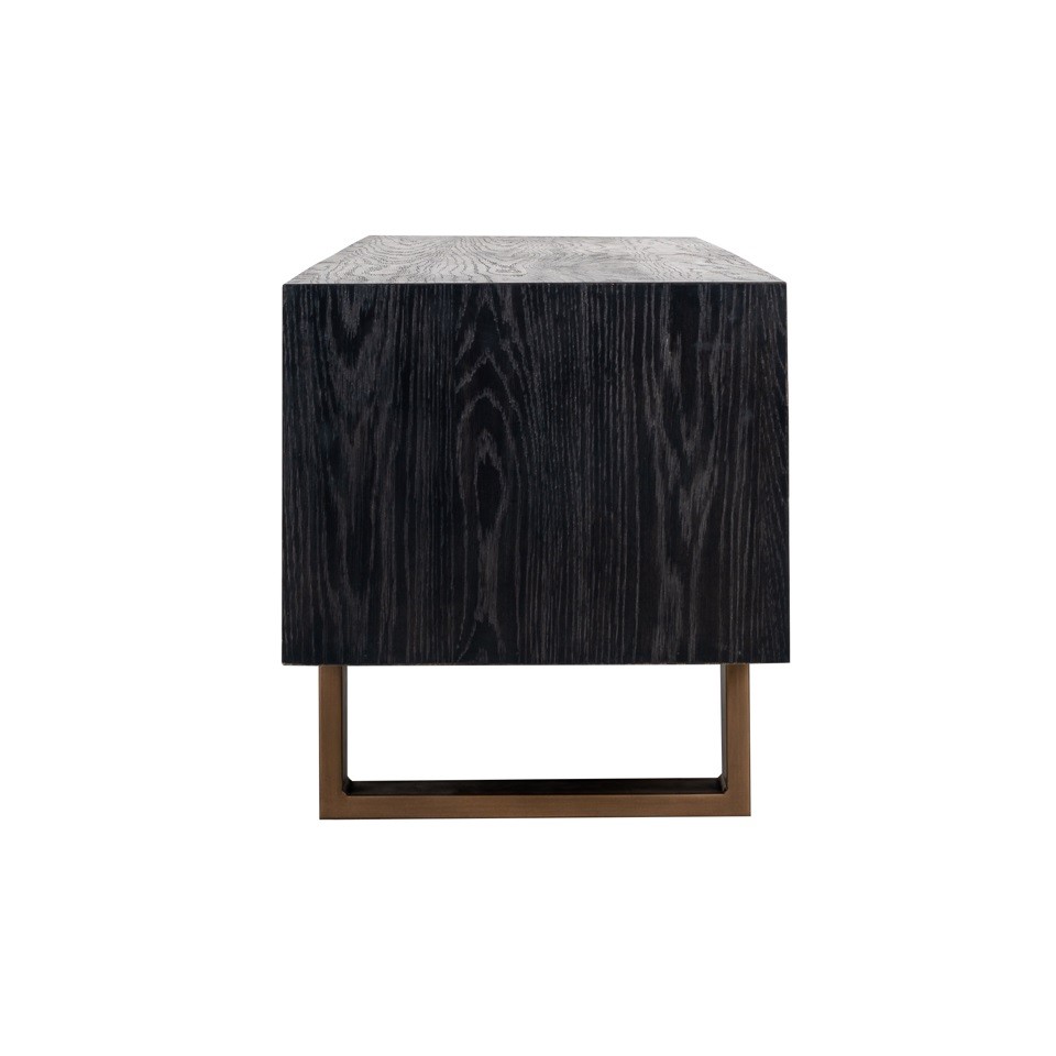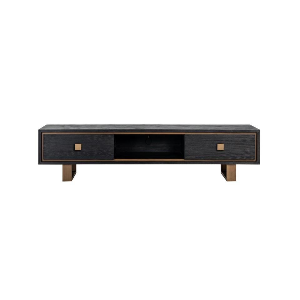 Szafka RTV RICHMOND HUNTER z czarnego dębu i stali nierdzewnej to elegancki mebel o geometrycznej formie i luksusowych, mosiężnych detalach.