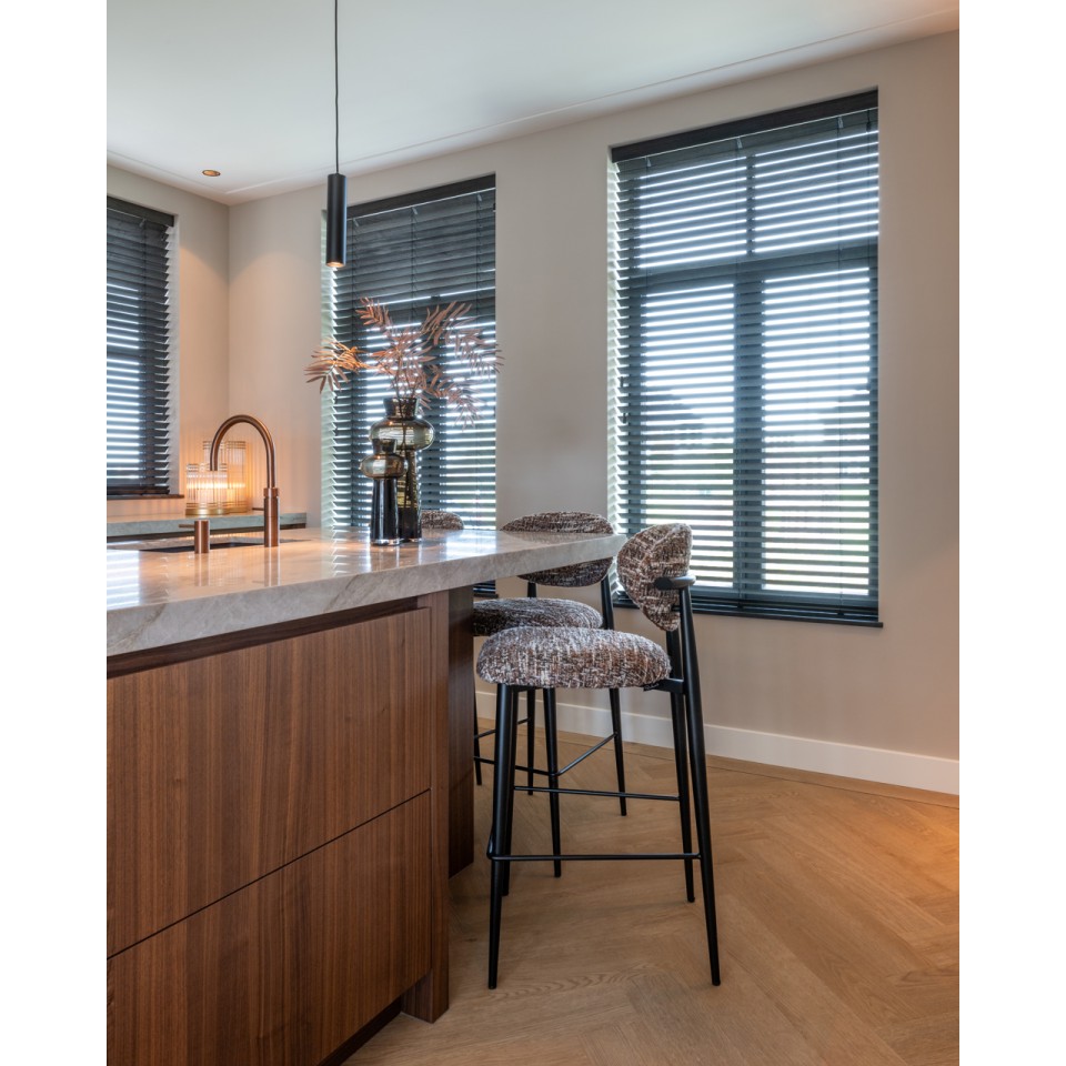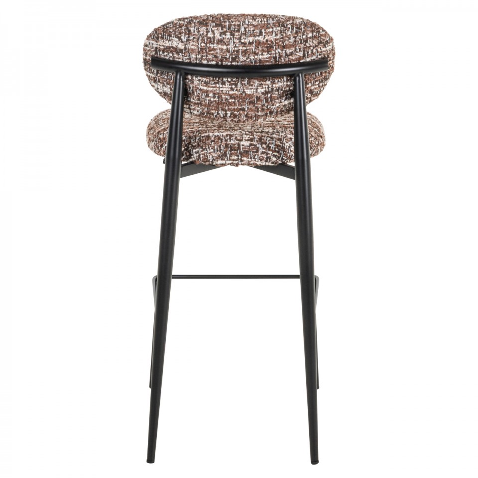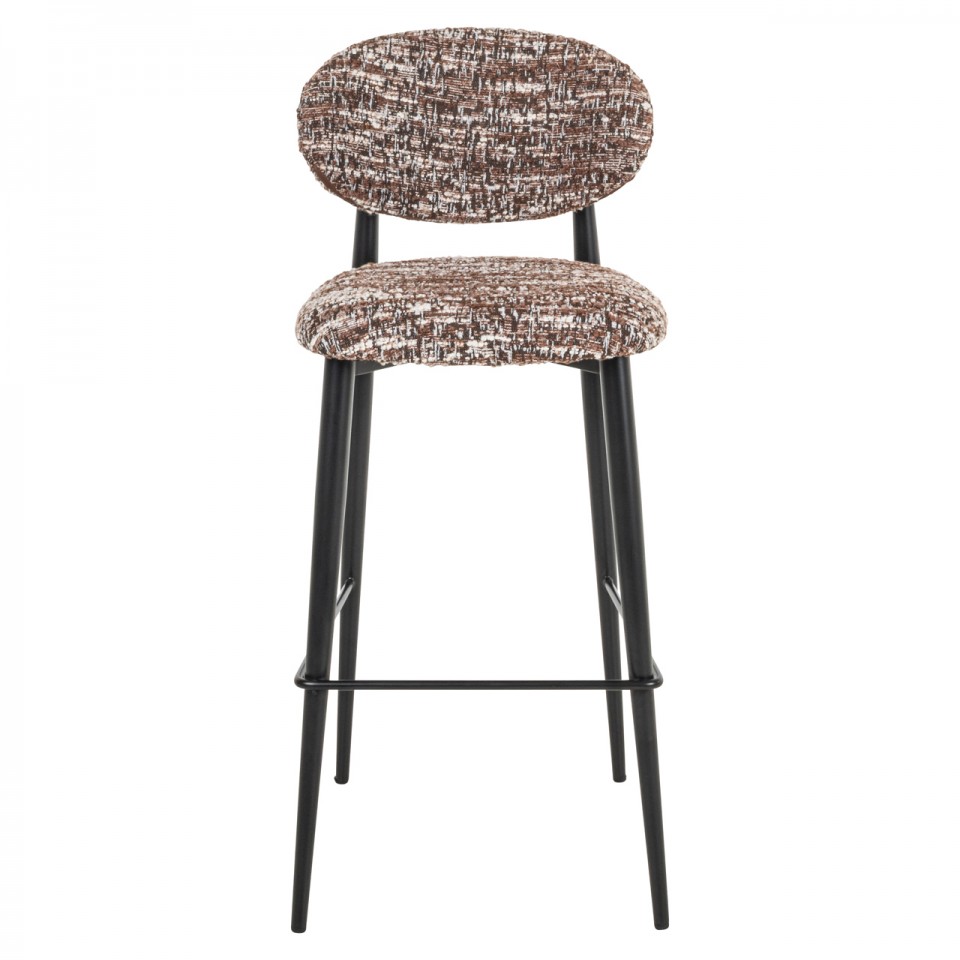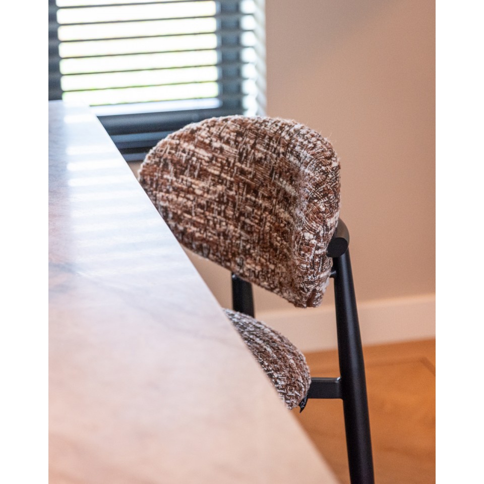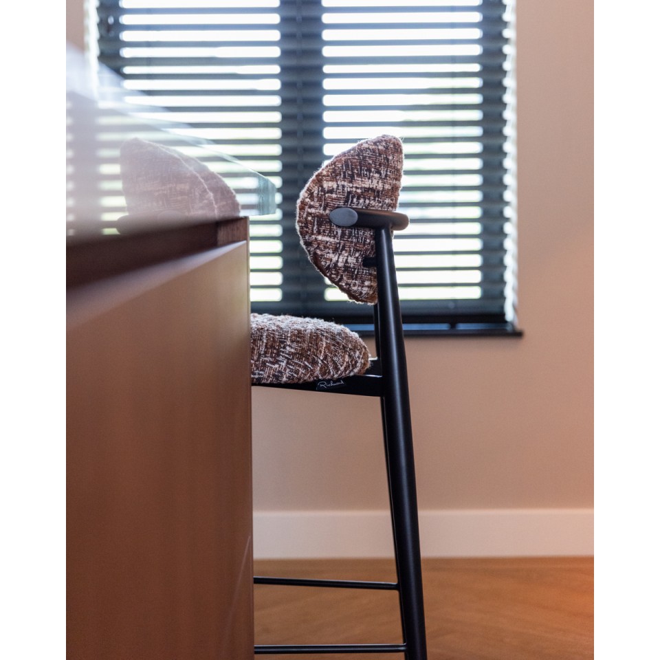 RICHMOND krzesło barowe DANTES hazel wyróżnia się elegancką, nowoczesną linią oraz subtelną kolorystyką. Melanżowa tapicerka w odcieniach brązu i beżu przyciąga wzrok i nadaje całości ponadczasowego charakteru.