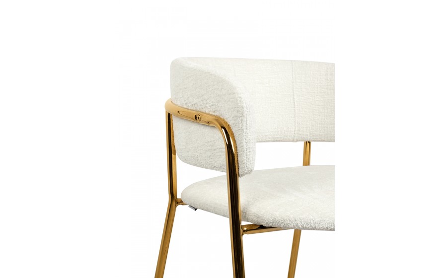 - Siedzisko oraz oparcie wykonane zostały z wysokiej jakości tkaniny o delikatnej fakturze w białym kolorze, co nadaje lekkości i klasy każdemu pomieszczeniu.