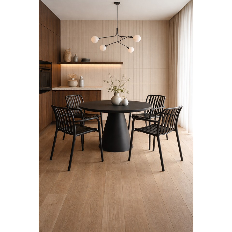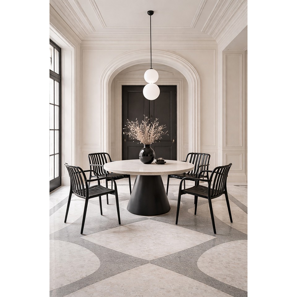 Stabilna konstrukcja zapewnia bezpieczeństwo użytkowania przy maksymalnym obciążeniu do 120 kg. Czerń o matowym wykończeniu nadaje krzesłu uniwersalny charakter, dzięki czemu z łatwością dopasuje się do różnorodnych aranżacji – od nowoczesnych jadalni po przestrzenie restauracyjne i eventowe.