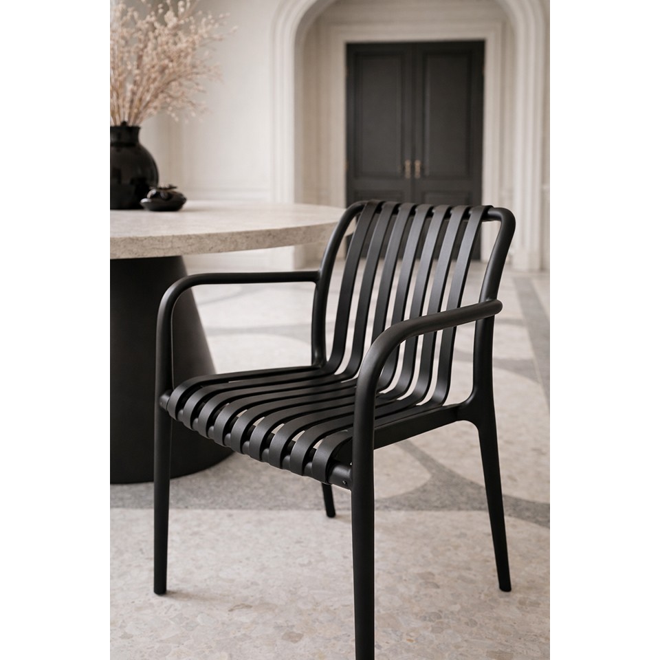 Krzesło MODESTO STRIPS ARM czarne to nowoczesny, sztaplowany model z podłokietnikami, przeznaczony do wnętrz, restauracji i ogródków.