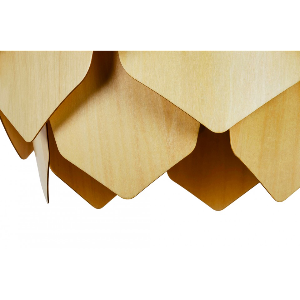 Oprawa została wykonana w całości z naturalnej sklejki w kolorze drewna, co podkreśla jej ekologiczny i dekoracyjny wymiar. Ażurowa konstrukcja klosza pozwala światłu delikatnie przenikać przez formę, tworząc nastrojowy efekt świetlny.