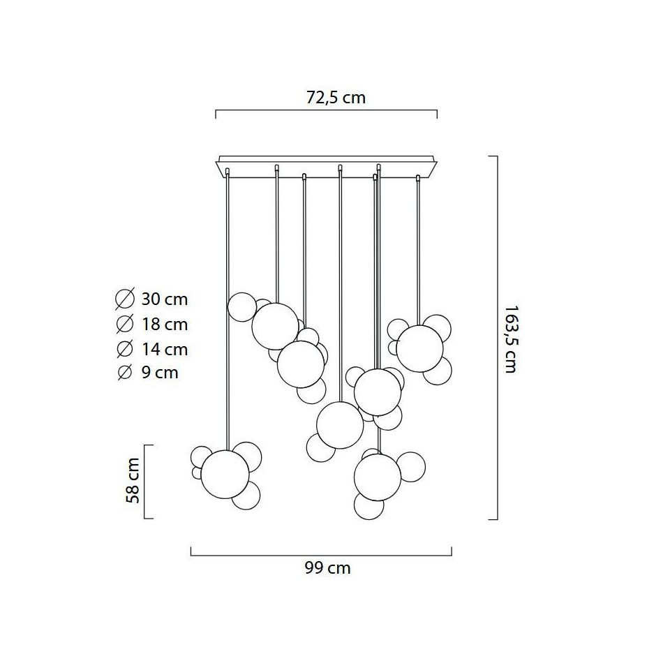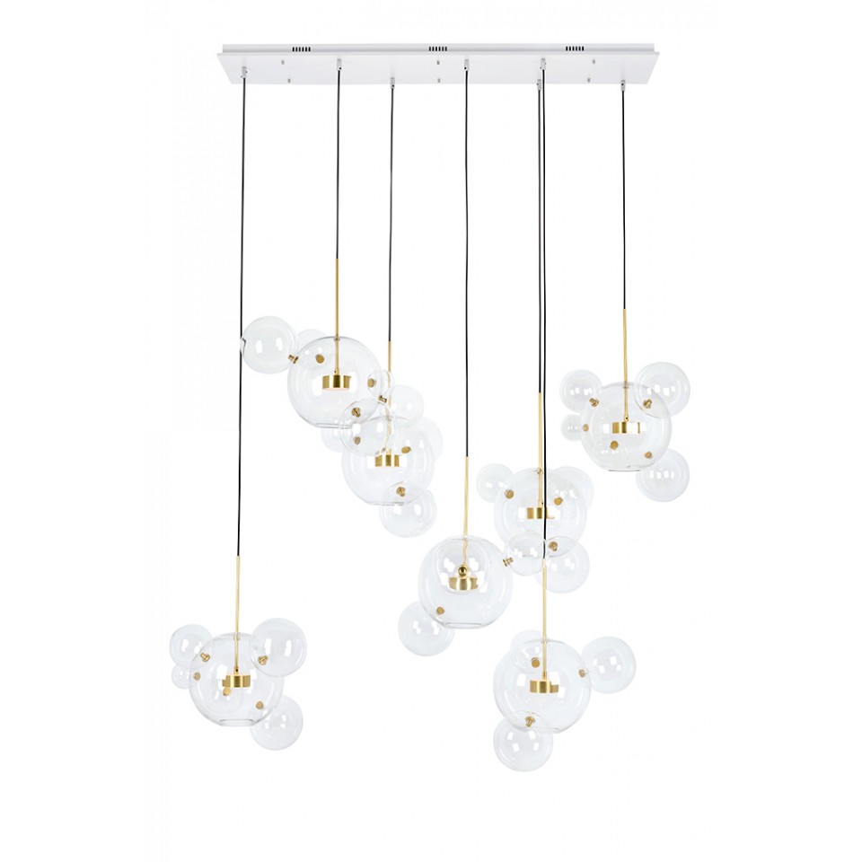 Lampa wisząca MOOSEE CAPRI LINE 7 LED złota to efektowna instalacja oświetleniowa o rzeźbiarskim charakterze. Siedem głównych kulistych kloszy zawieszonych na przewodach wychodzących z jednej podsufitki tworzy przestrzenną, dynamiczną kompozycję inspirowaną formą unoszących się baniek mydlanych.