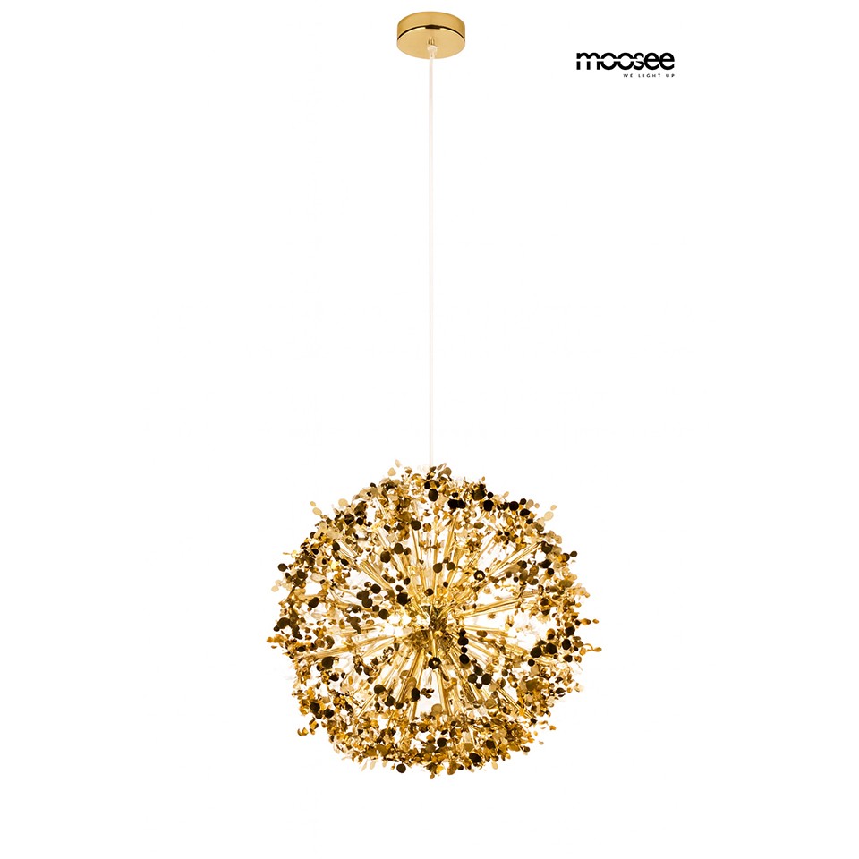 Lampa wisząca MOOSEE MONETE 65 w złotym wykończeniu to spektakularna, trójwymiarowa dekoracja świetlna o biżuteryjnym charakterze, idealna do luksusowych i reprezentacyjnych wnętrz.