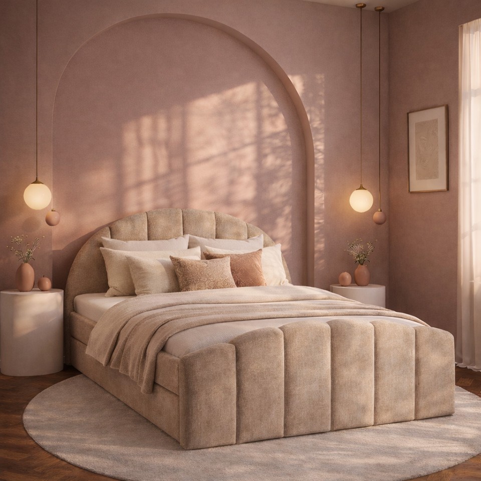 W pełni tapicerowane wykończenie z miękkiej tkaniny szenilowej o matowej strukturze nadaje łóżku ciepły, spokojny wygląd sprzyjający relaksowi. Beżowy odcień wprowadza do sypialni harmonię i łatwo komponuje się z różnymi stylami aranżacyjnymi.