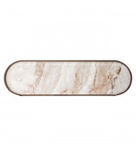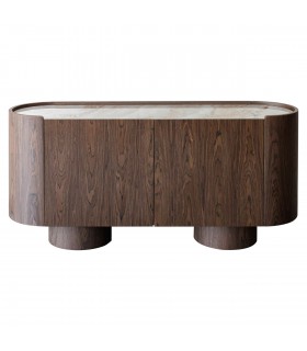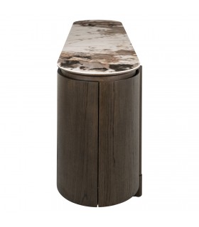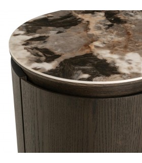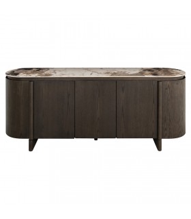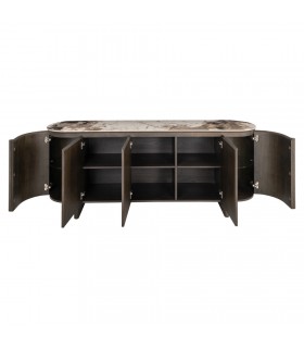 RICHMOND komoda CALLAHAN brązowa to elegancka komoda z forniru dębowego i drewna z recyklingu, wzbogacona ceramicznym blatem o marmurowym wykończeniu.