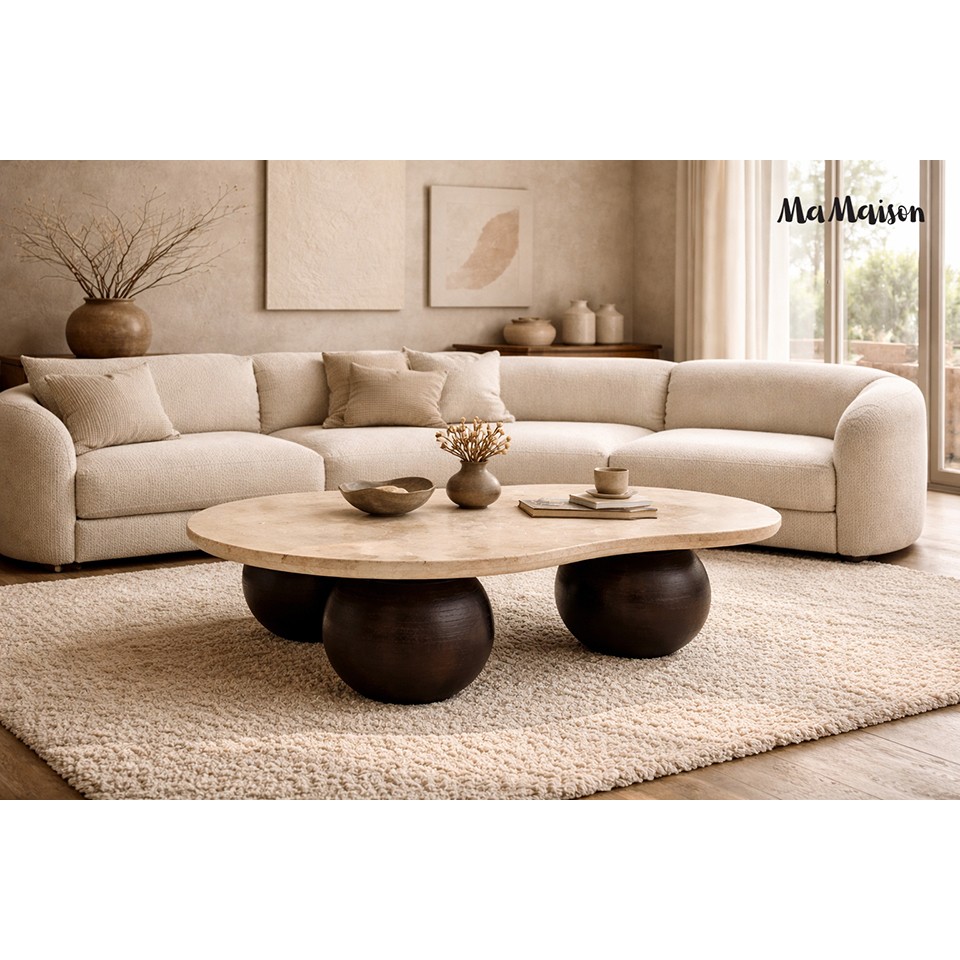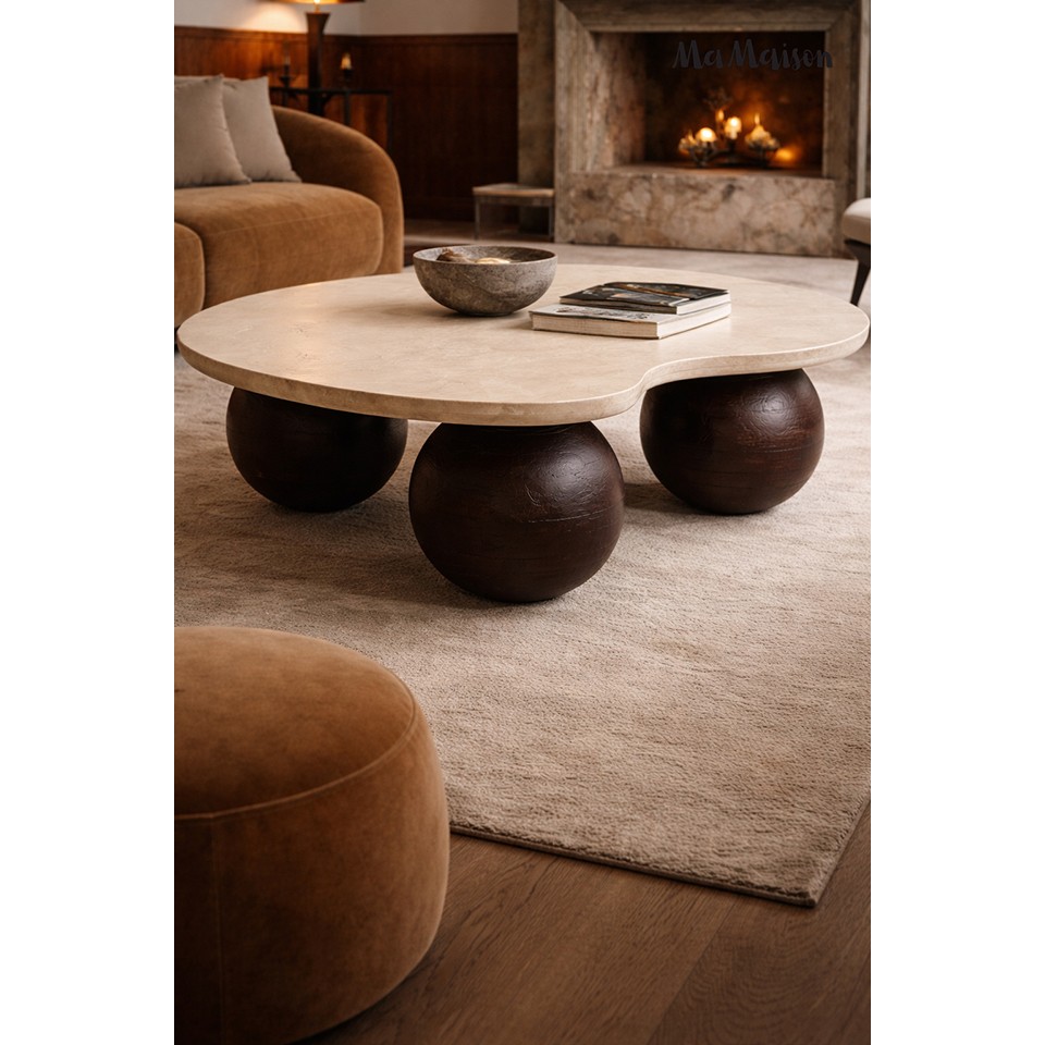 Połączenie nowatorskiego designu i elegancji – stolik kawowy ORGANIC od MaMaison to mebel, który zachwyca swoją wyjątkową formą i starannie dobranymi materiałami. Beżowy blat z trawertynu oraz masywna, drewniana podstawa tworzą niepowtarzalny efekt, wpisując się zarówno w aranżacje nowoczesne, jak i te inspirowane naturą czy stylem japandi.