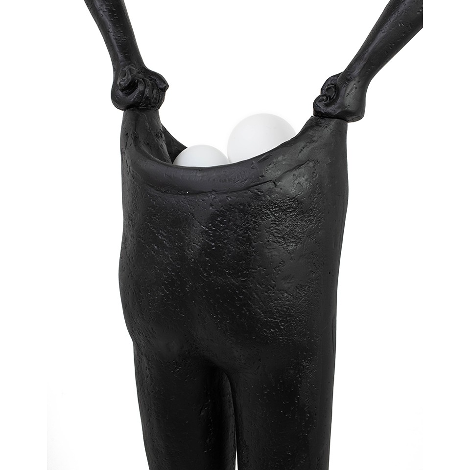 Centralnym punktem lampy są szklane klosze, subtelnie ukryte w "spodniach" figury. Klosze te, dzięki swojej nietypowej formie, nadają zaskakujący, artystyczny wyraz, który przyciąga wzrok i pobudza wyobraźnię. Dodatkowym atutem produktu są pęcherzyki powietrza występujące na powierzchni klosza – naturalny efekt ręcznej obróbki szkła, który podkreśla unikalny charakter lampy.