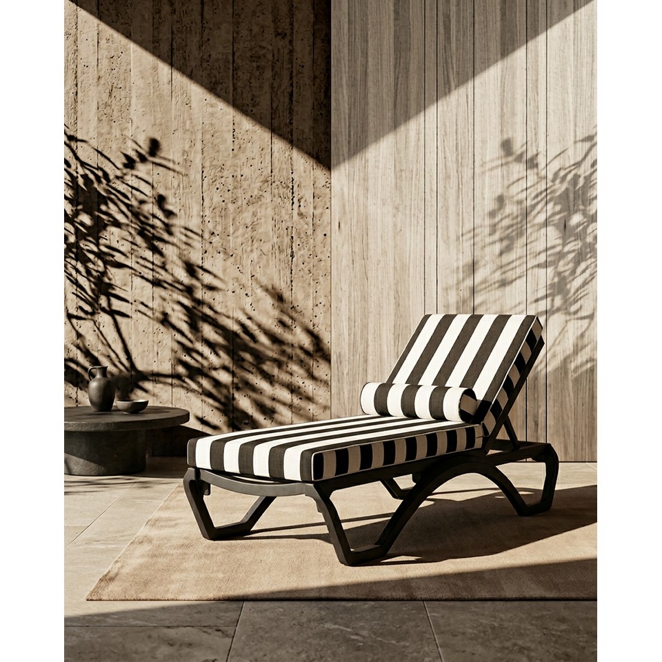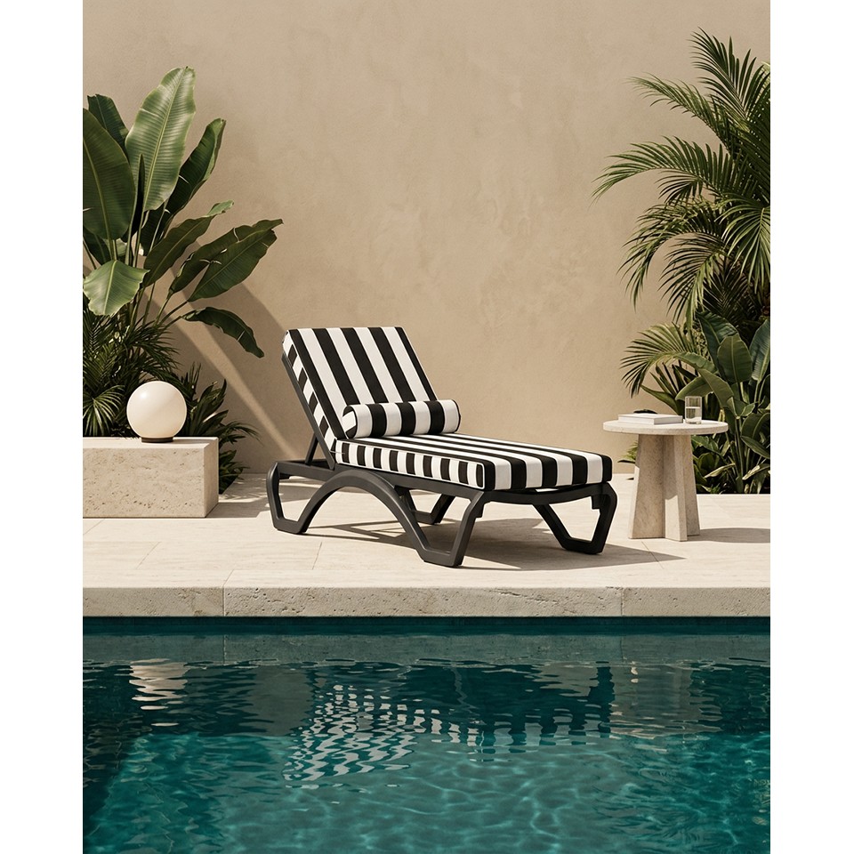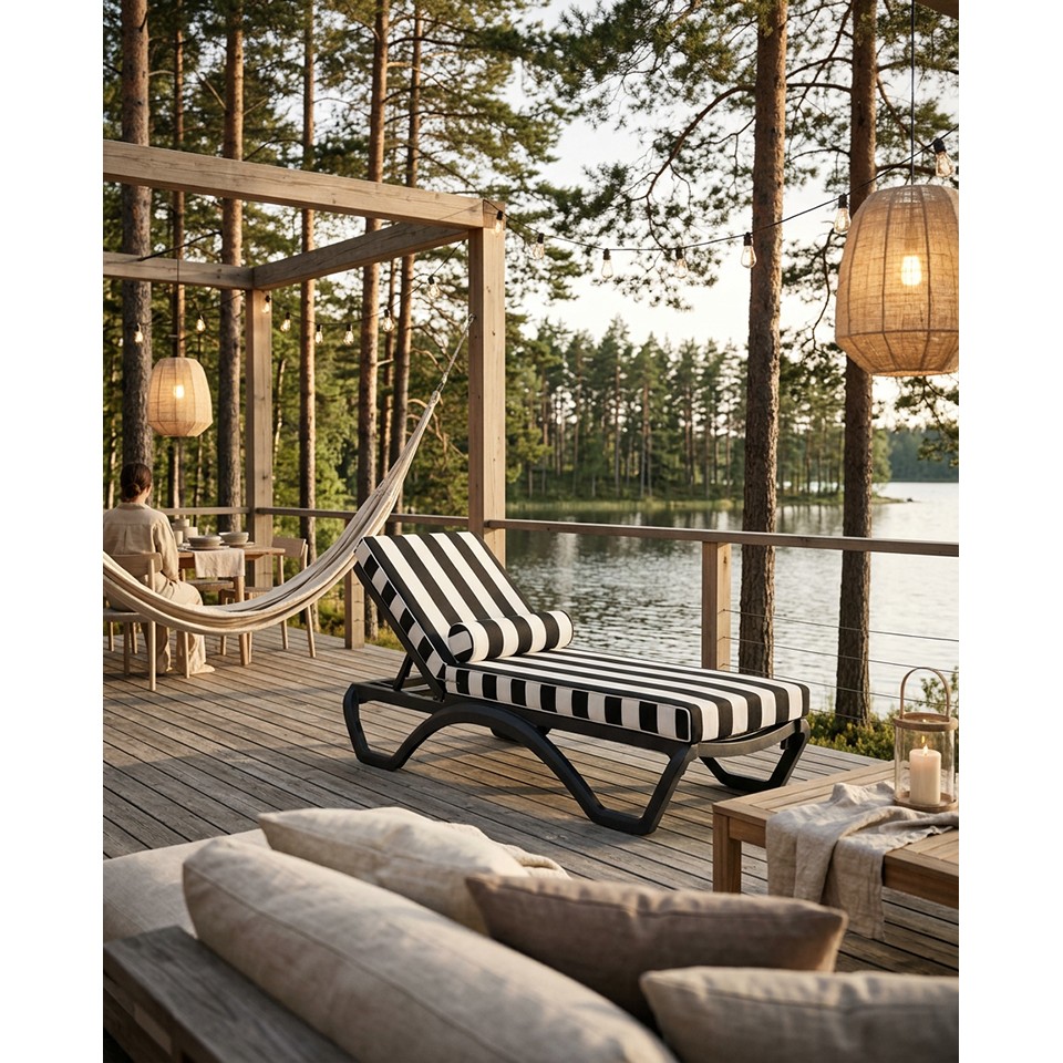 Zestaw ogrodowy NICEA przyciąga uwagę wyrazistym biało-czarnym wzorem w pasy, który nadaje całości elegancki, wakacyjny charakter inspirowany luksusowymi resortami. To propozycja dla osób ceniących styl i ponadczasową estetykę.