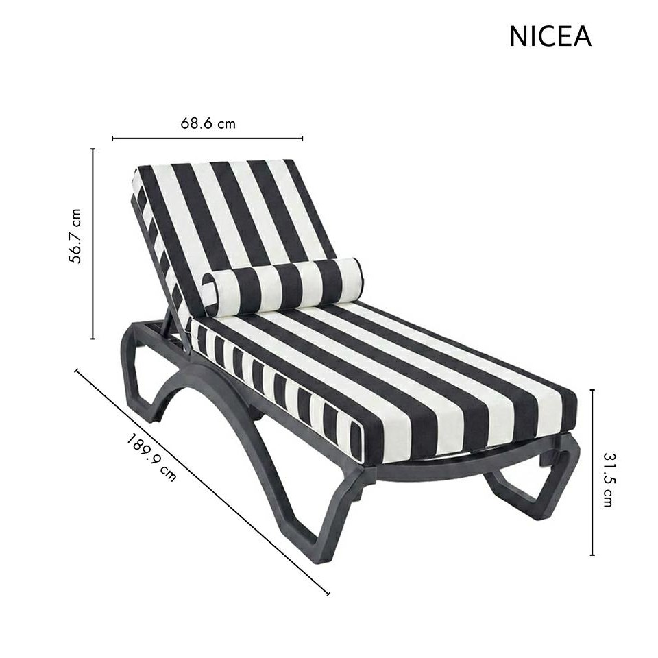 Zestaw ogrodowy NICEA leżak z materacem i poduszką biało-czarny to stylowe połączenie nowoczesnego designu, wysokiego komfortu oraz trwałości, idealne do eleganckich stref wypoczynku na świeżym powietrzu.