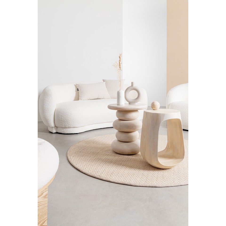 Naturalne drewno mango w odcieniu beżu prezentuje szlachetną fakturę, a wykończenie nitrocelulozowe podkreśla zarówno surowy, jak i elegancki charakter materiału. Dopracowane detale oraz solidne wykonanie nadają stolikowi trwałość i unikatowy wygląd.