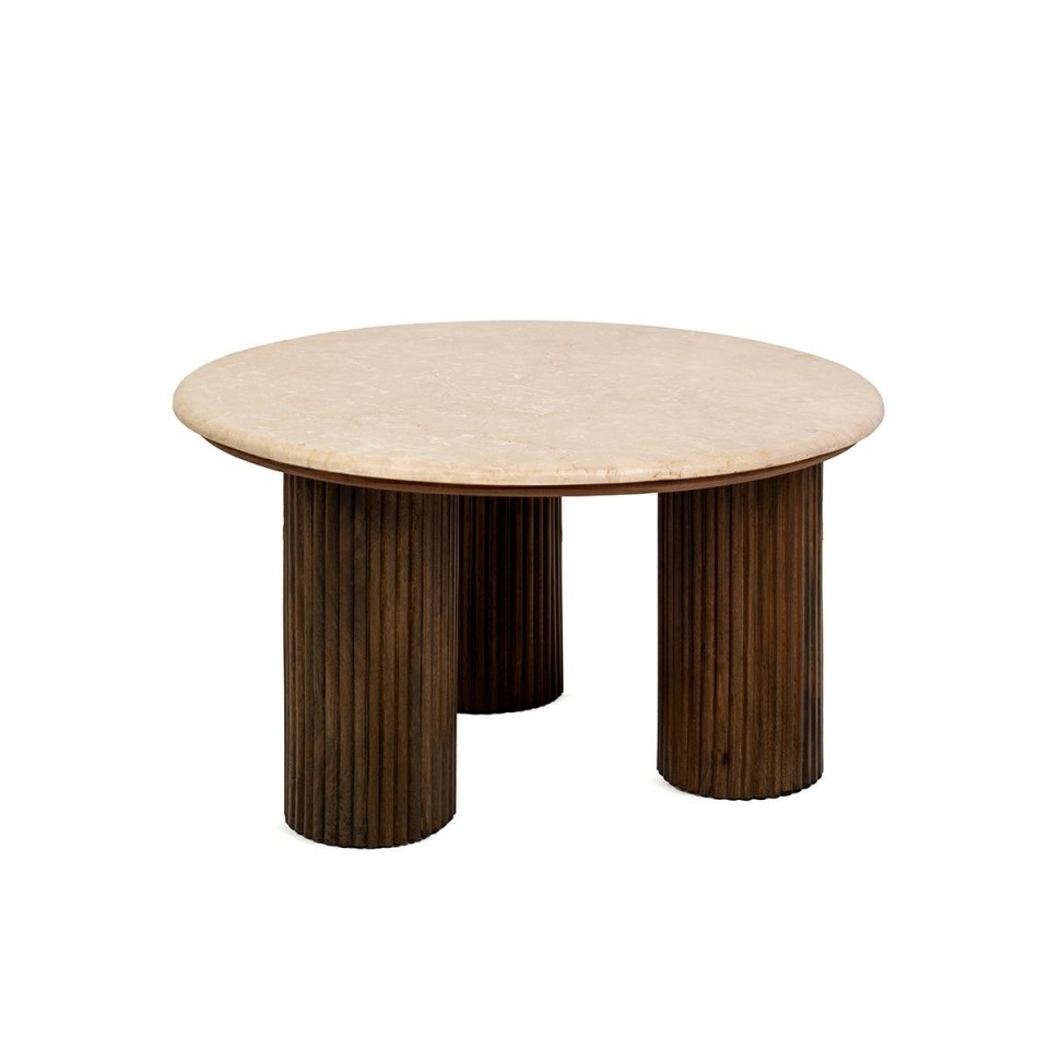 Stabilna podstawa z drewna mango w brązowym odcieniu wprowadza do bryły nutę lekko retro i strukturalnej wyrazistości. Okrągła forma o średnicy 68 cm sprawia, że model doskonale sprawdzi się jako centralny stolik kawowy w salonie, jak również jako elegancki akcent w nowoczesnych i klasycznych przestrzeniach.