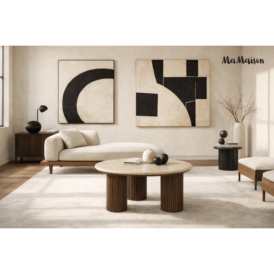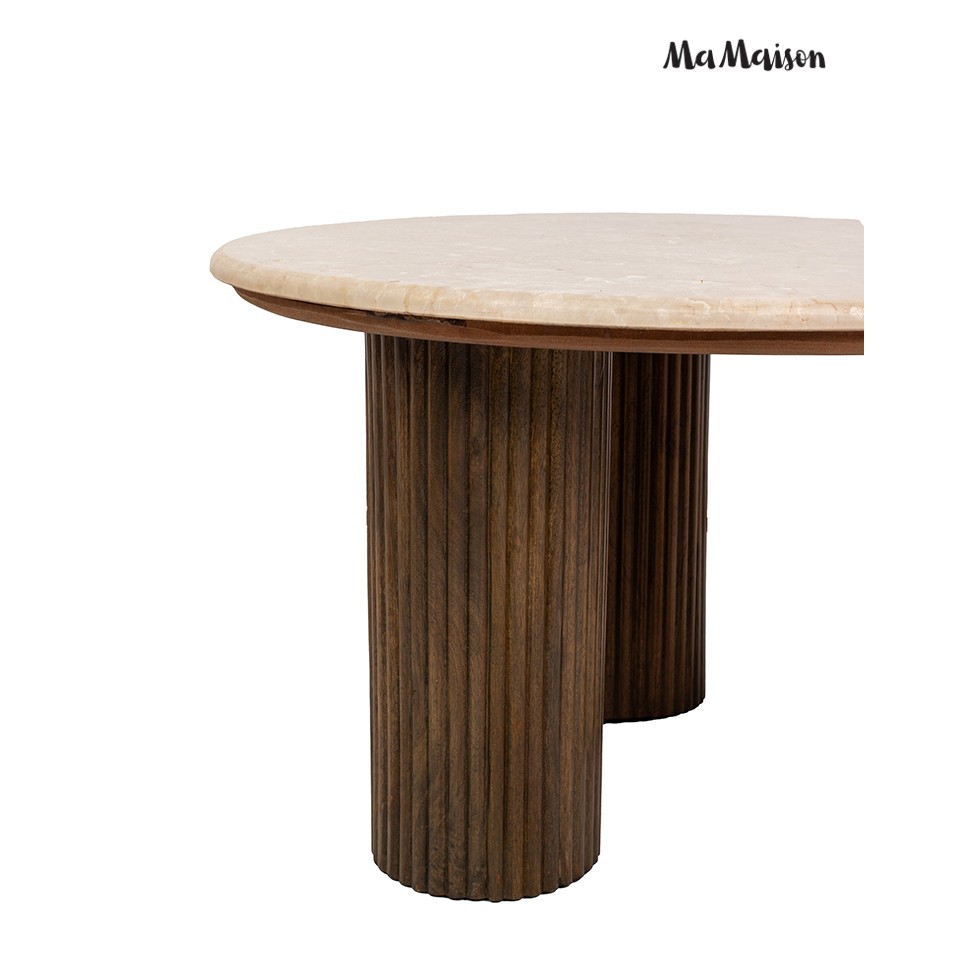 MaMaison RAGNO 68 to elegancki stolik kawowy z marmurowym blatem Boto Chino i stabilną podstawą z drewna mango, łączący naturalne piękno z ponadczasowym designem.