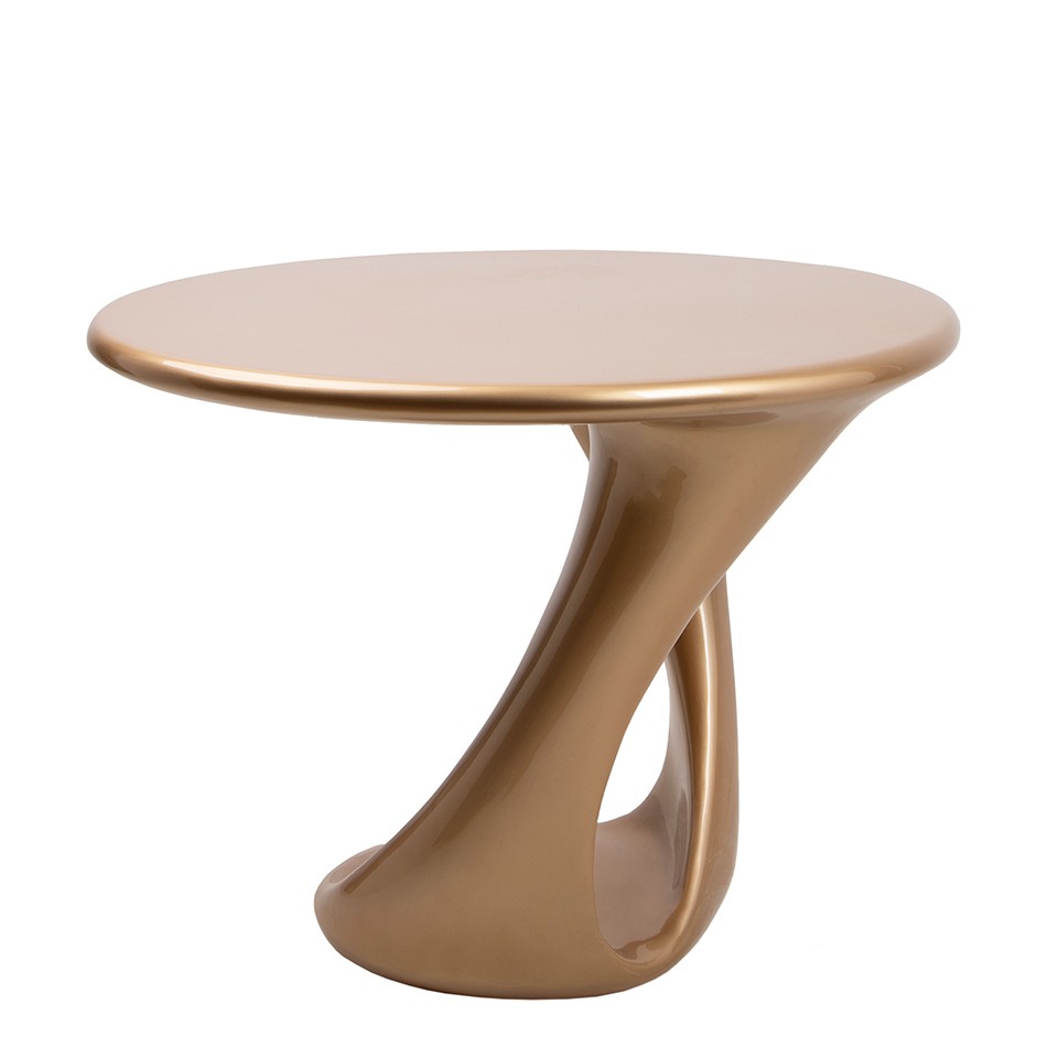 Wykonany z wysokiej jakości żywicy, prezentuje perfekcyjnie dopracowaną, organiczną linię podstawy, która harmonizuje z solidnym, okrągłym blatem. Materiał pozwala uzyskać gładką, efektownie połyskującą powierzchnię o głębokim, złotym wykończeniu, które pięknie odbija światło.