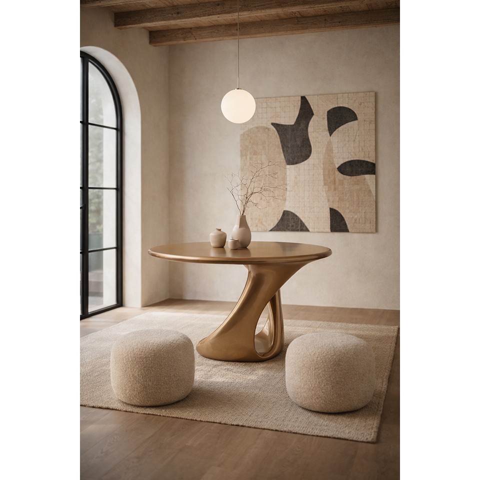Stół SHANGRI LA złoty to propozycja dla osób ceniących odważne wzornictwo oraz wyraziste formy inspirowane sztuką. Jego dynamiczna i falująca konstrukcja tworzy wrażenie płynnego ruchu, nadając wnętrzu nowoczesny i luksusowy charakter.